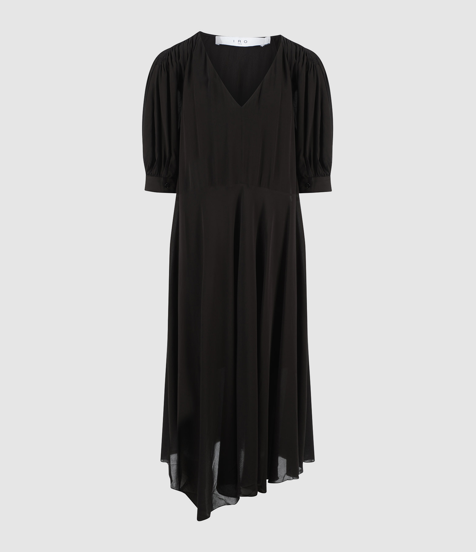 Robe noire fluide. Manches ballons 3/4. Col en V. Base asymétrique. Doublée.