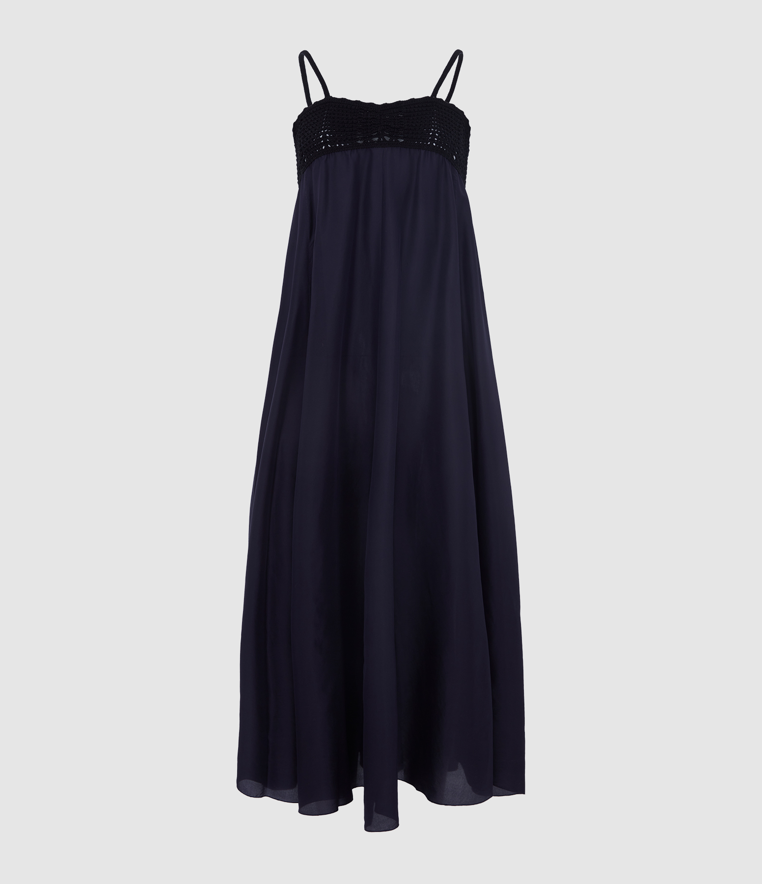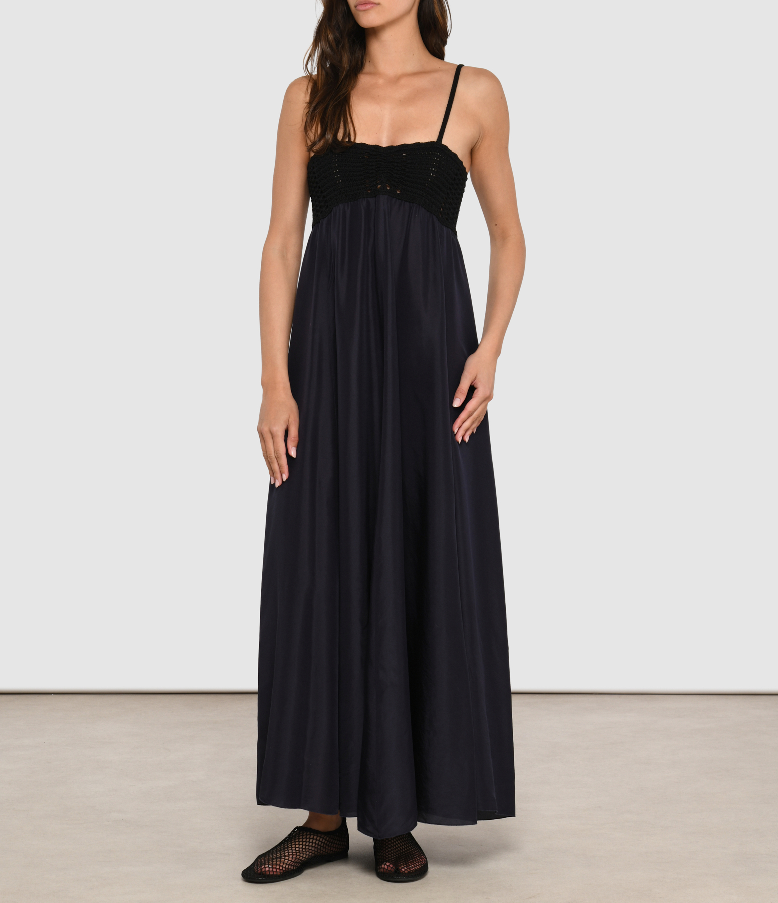 Robe longue fluide, sublimée par une poitrine en crochet noir.