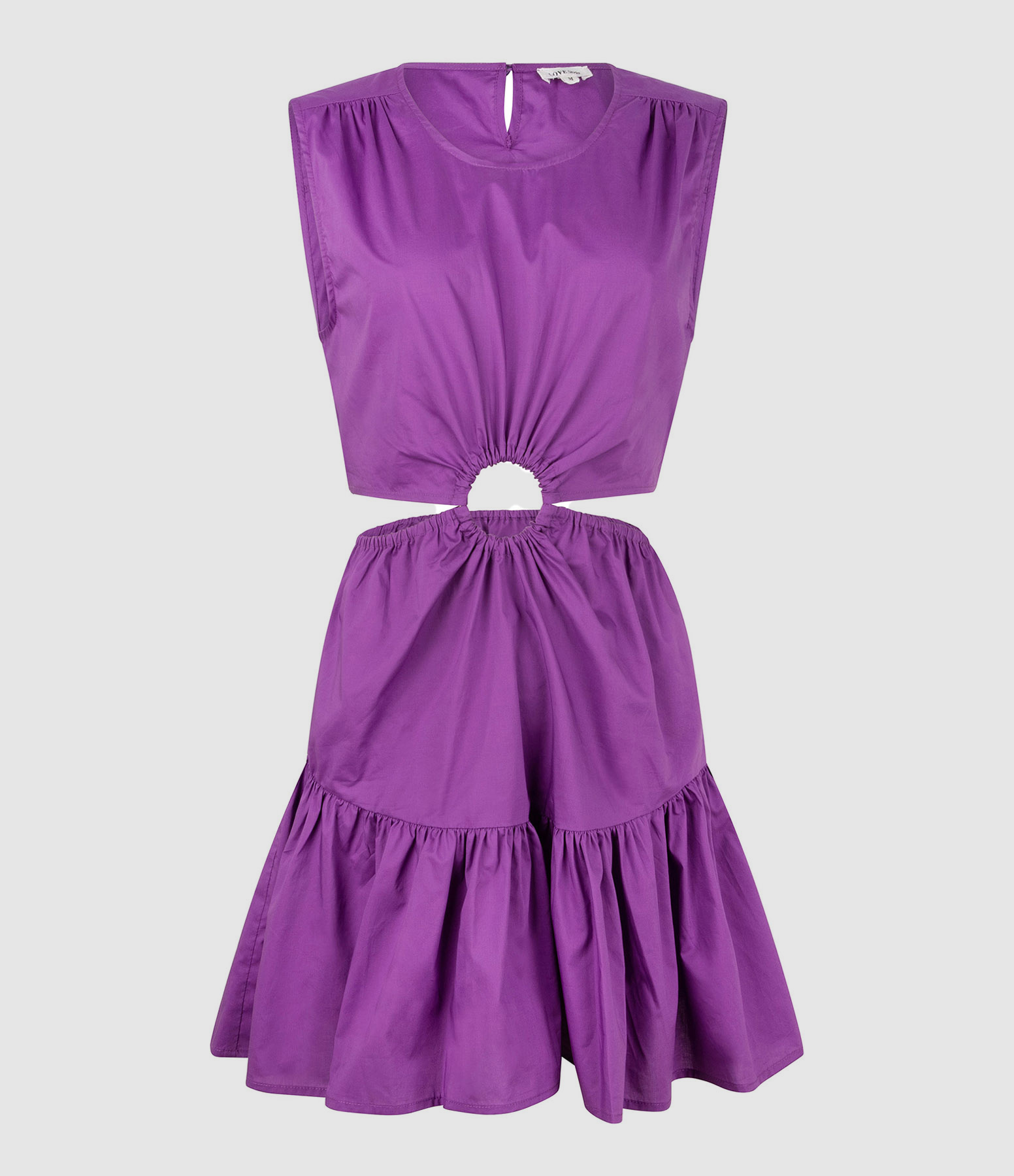 Robe courte en coton violet. Anneau qui relie le haut et le bas de la robe. Ouverte au niveau du ventre. Sans manches. Col rond. Détails plissés sur les épaules et l'empiècement arrière. Coupe évasée. Base droite.