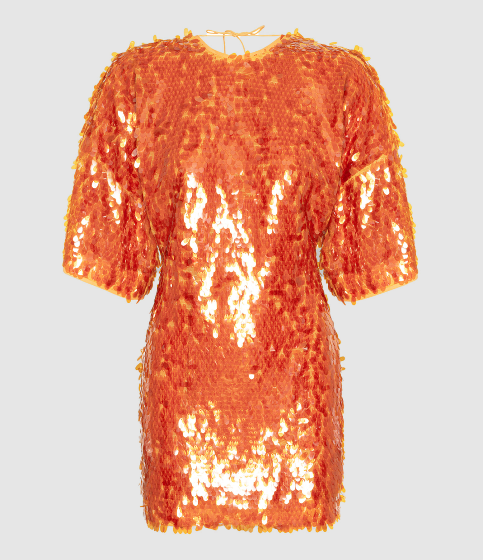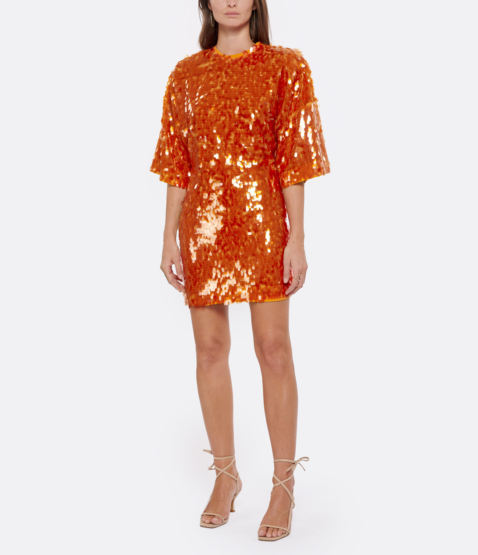 Robe courte en tulle orange et sequins rouges. Col rond. Dos nu avec lien d'attache dans la nuque. Manches 3/4 dolman larges. Coupe ajustée. Base droite. Doublée.
