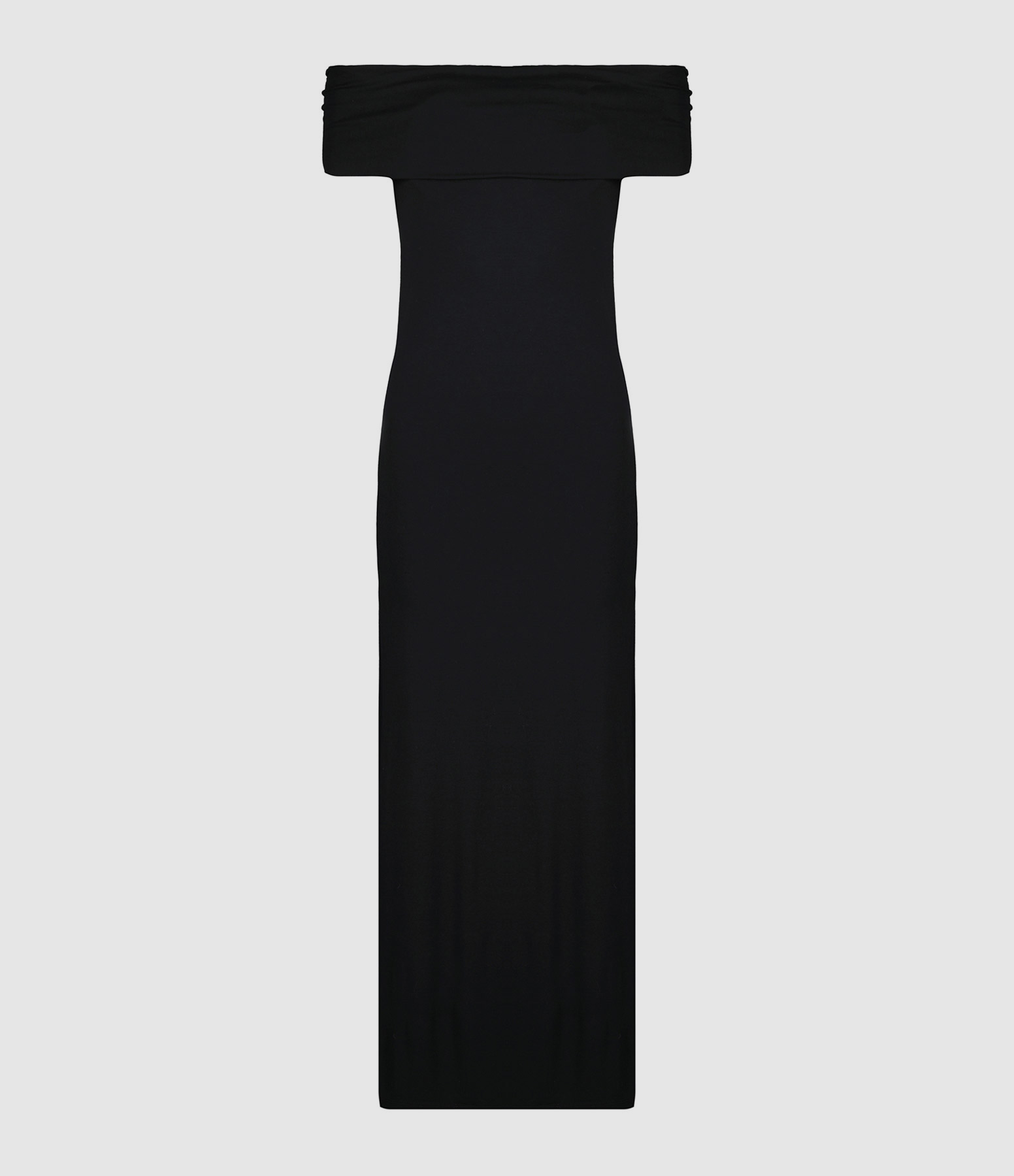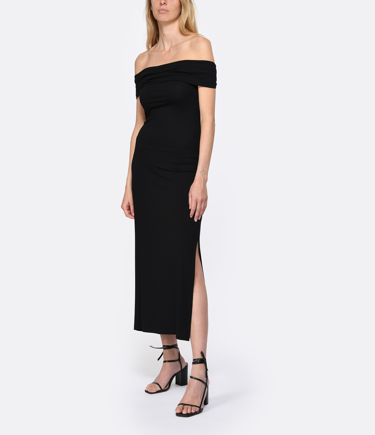 Robe longue noire col bardot. Coupe droite. Base droite avec fentes de 40 cm sur le côté gauche.