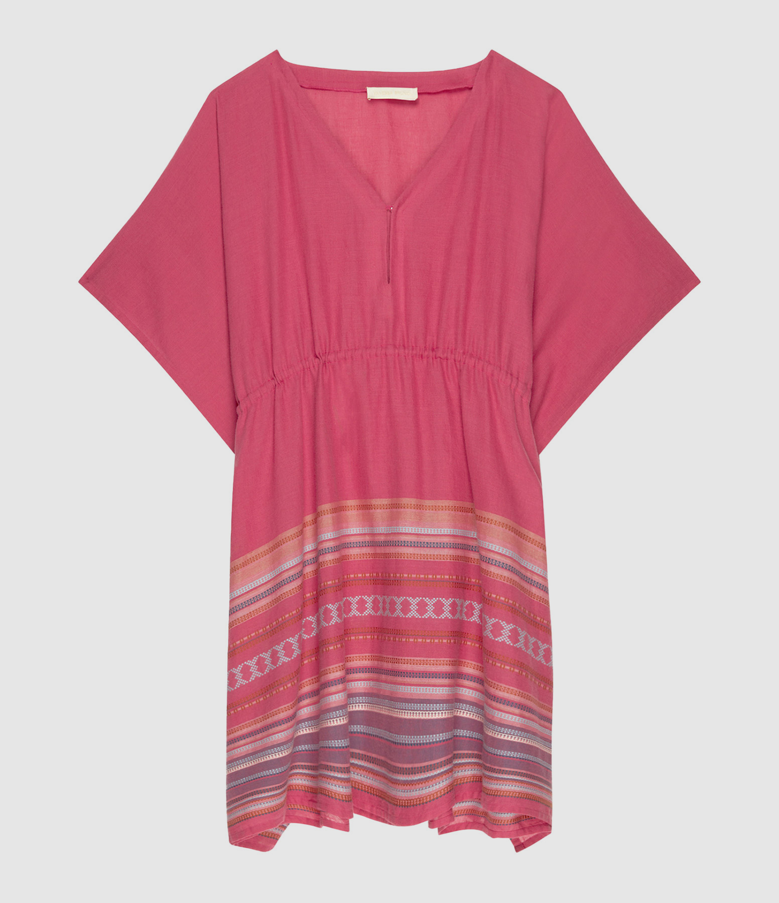 Robe courte rose avec broderie multicolore sur le bas. Manches courtes. Col en V. Lien de serrage à la taille. Coupe droite. Base droite.