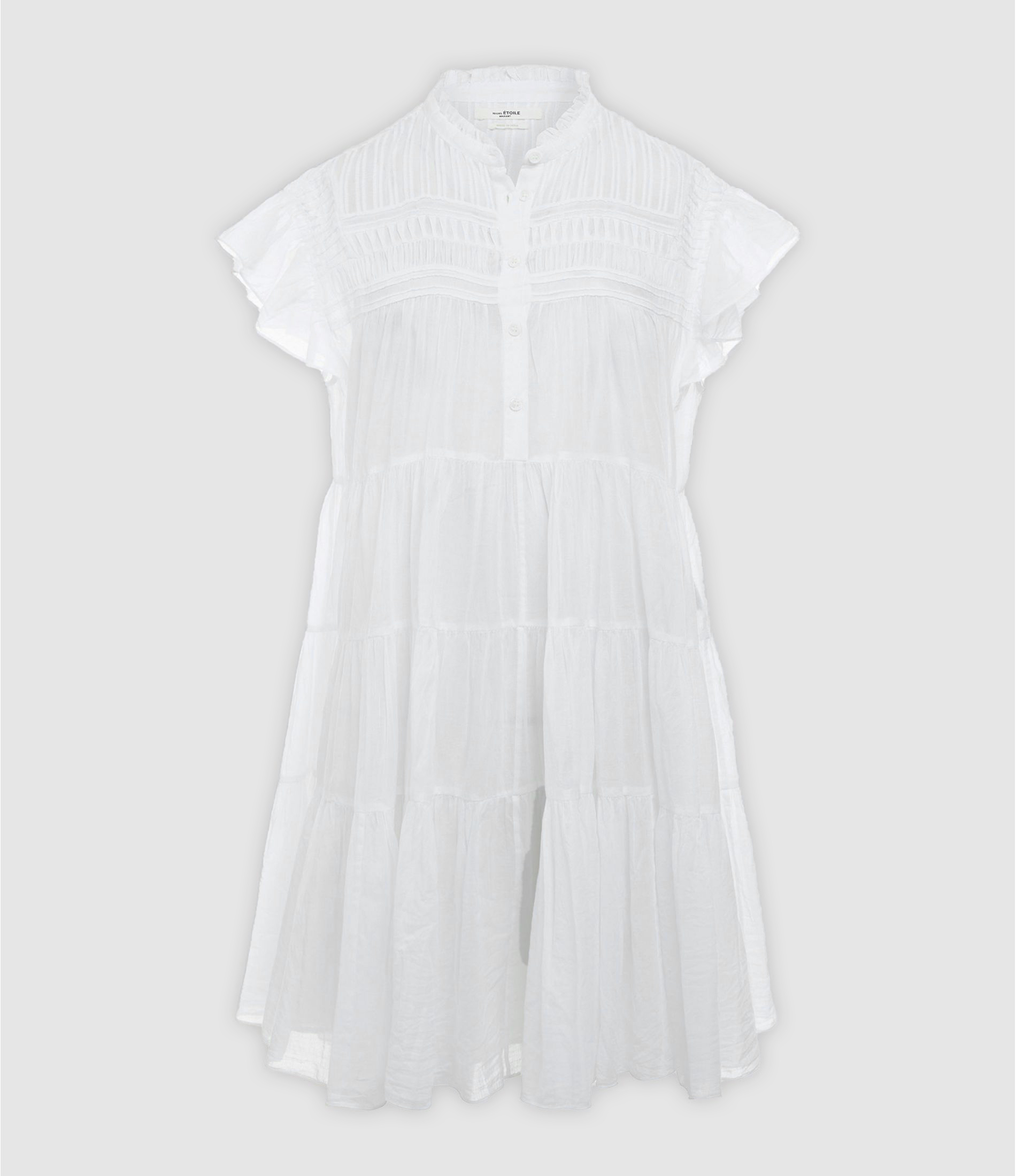 Robe courte en voile de coton blanc ornée de fronces et de volants. Col montant volanté. Manches courtes. Fermeture boutonnée sur le devant. Coupe droite. Base droite. Doublée d'un fond de robe.