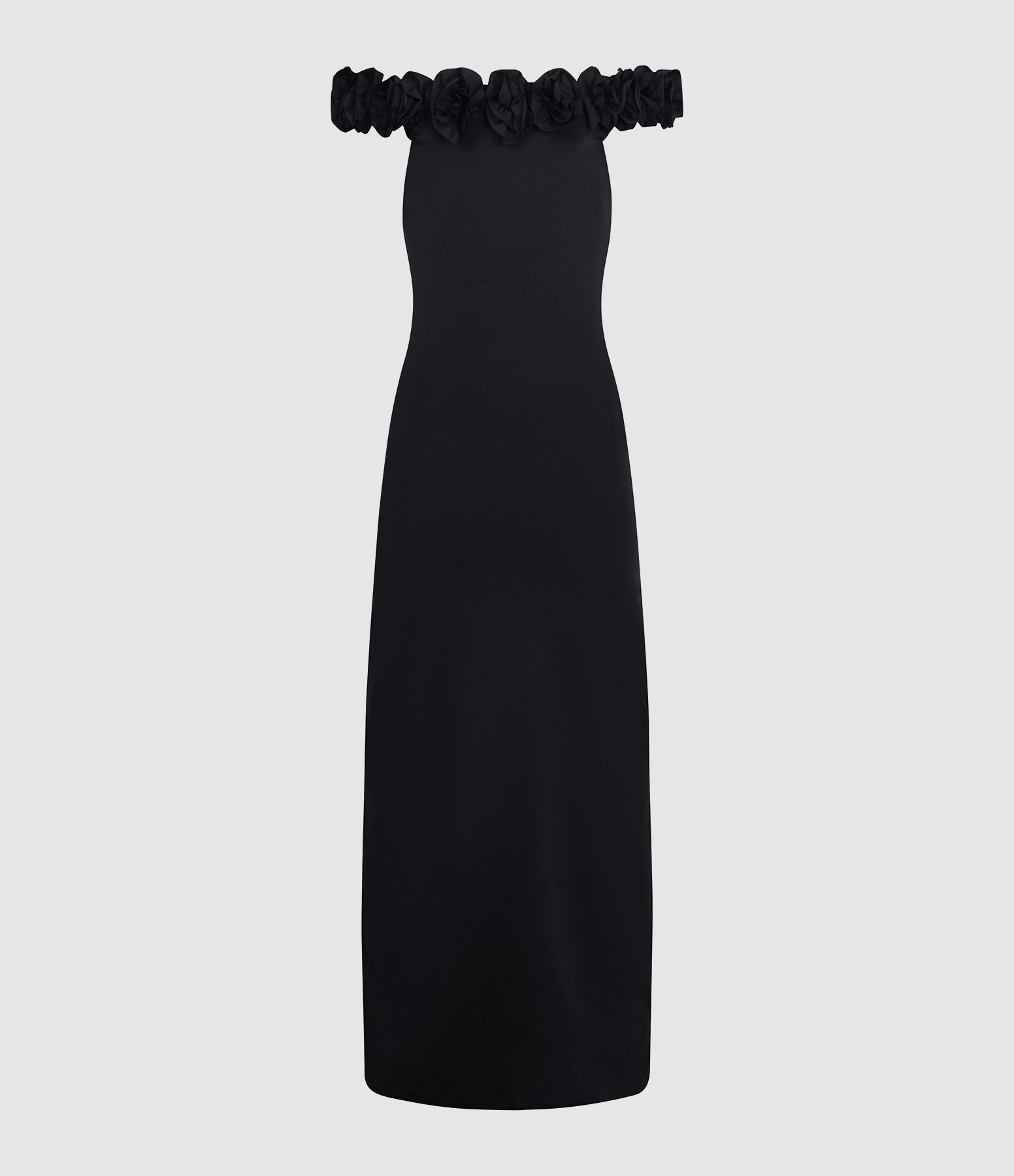 Robe longue fluide noire. Encolure parée de fleurs.