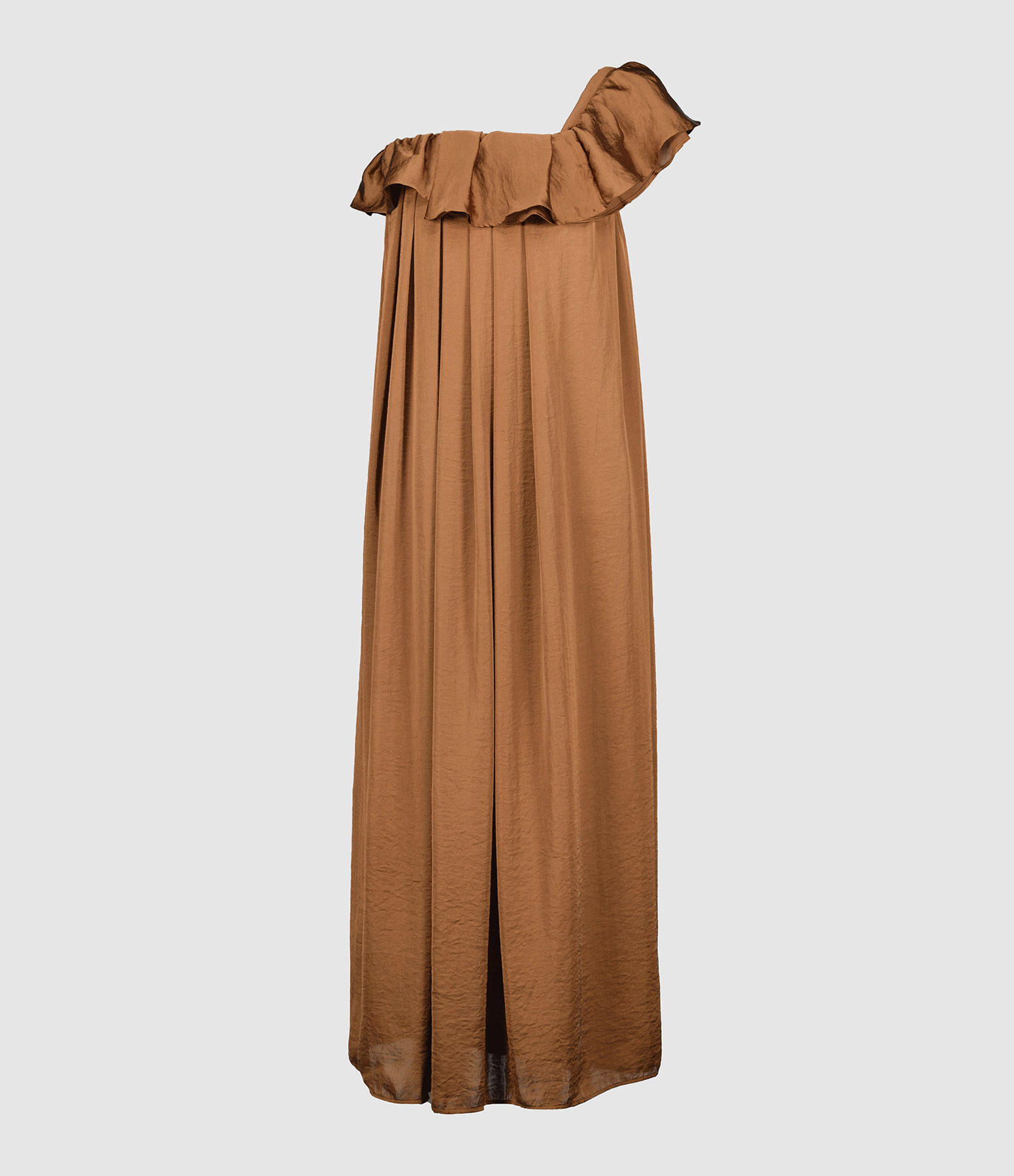 Robe longue marron, effet satiné. Manche unique à volant. Doublée. Coupe droite. Base droite.