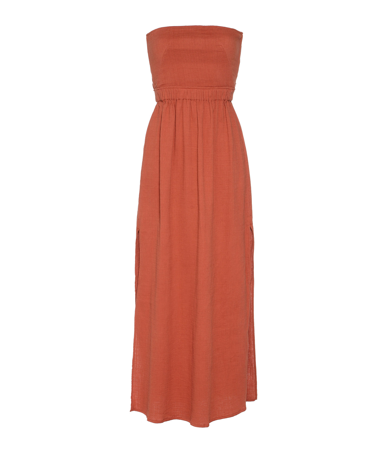 Robe longue en coton plissé. Bustier avec tissu à nouer dans le dos. Fendue depuis la base de chaque côté. Non doublée.