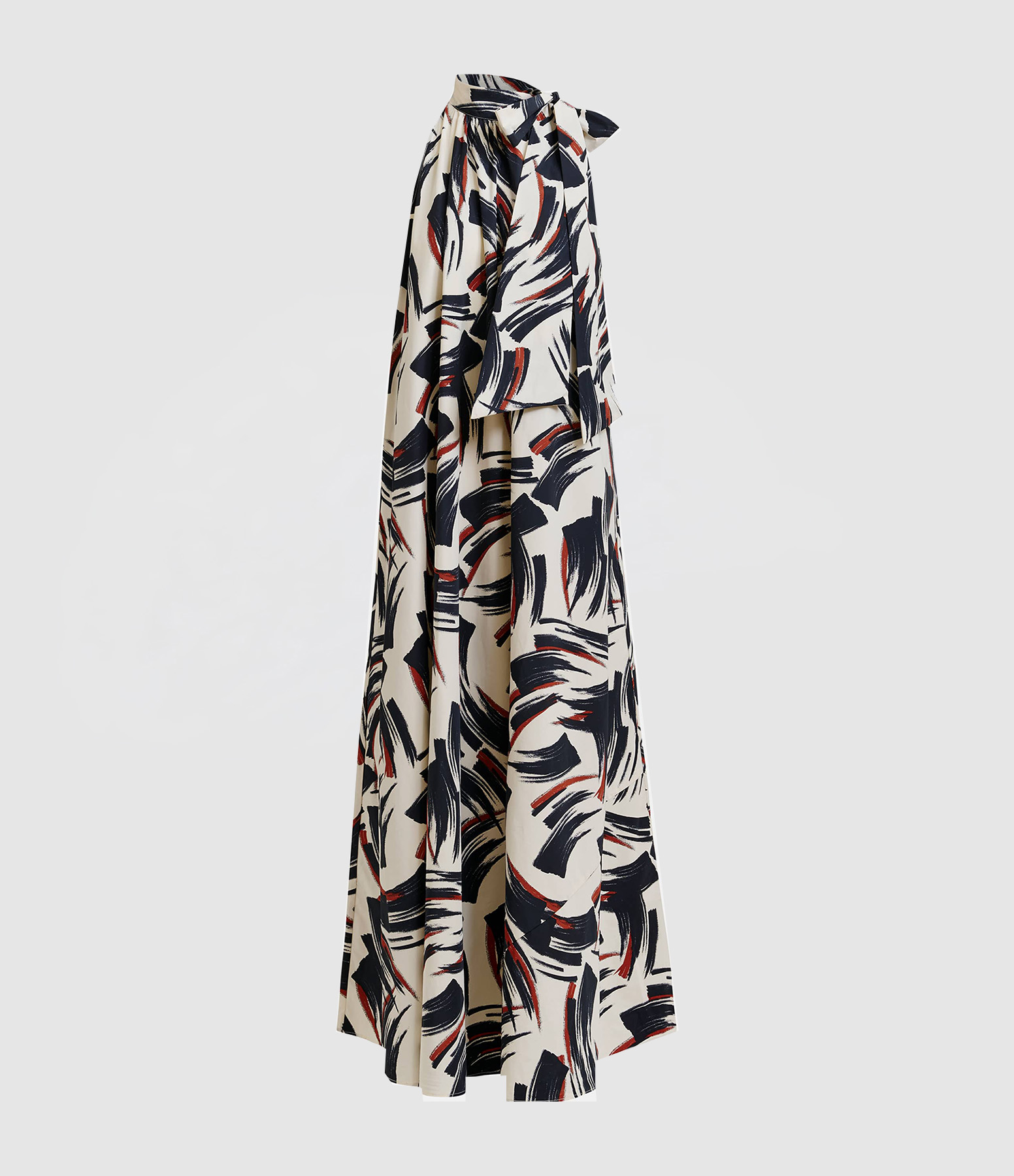 Robe longue à encolure haute et nœud blanc cassé, noire et brune. Coupe trapèze. Poches fendues.