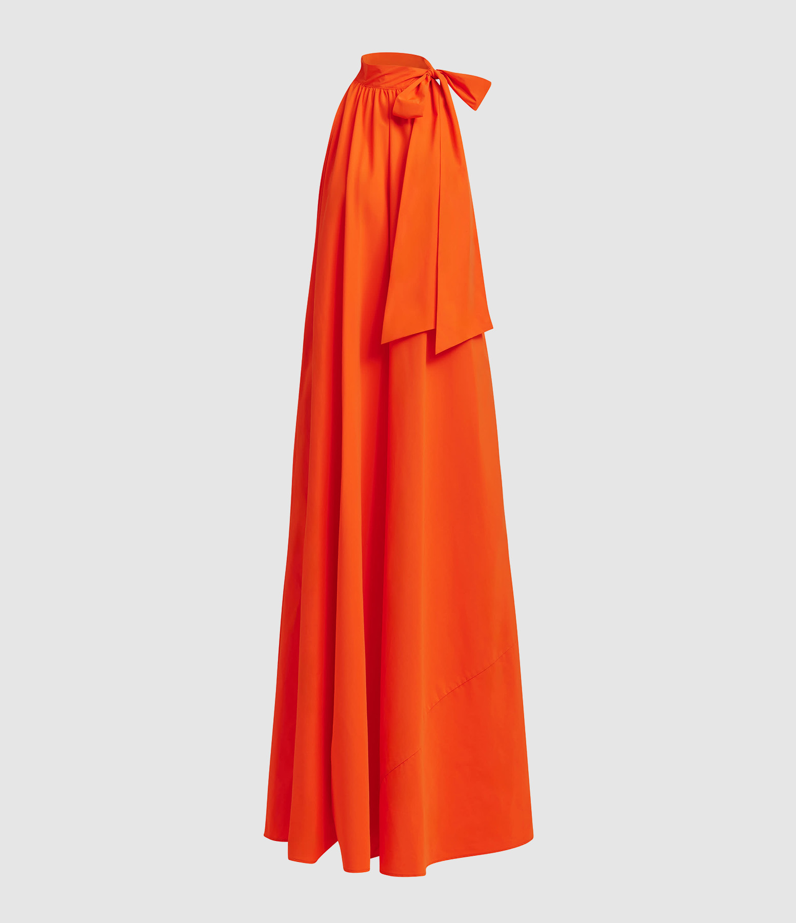 Robe longue à encolure haute et nœud orange. Coupe trapèze. Poches fendues.