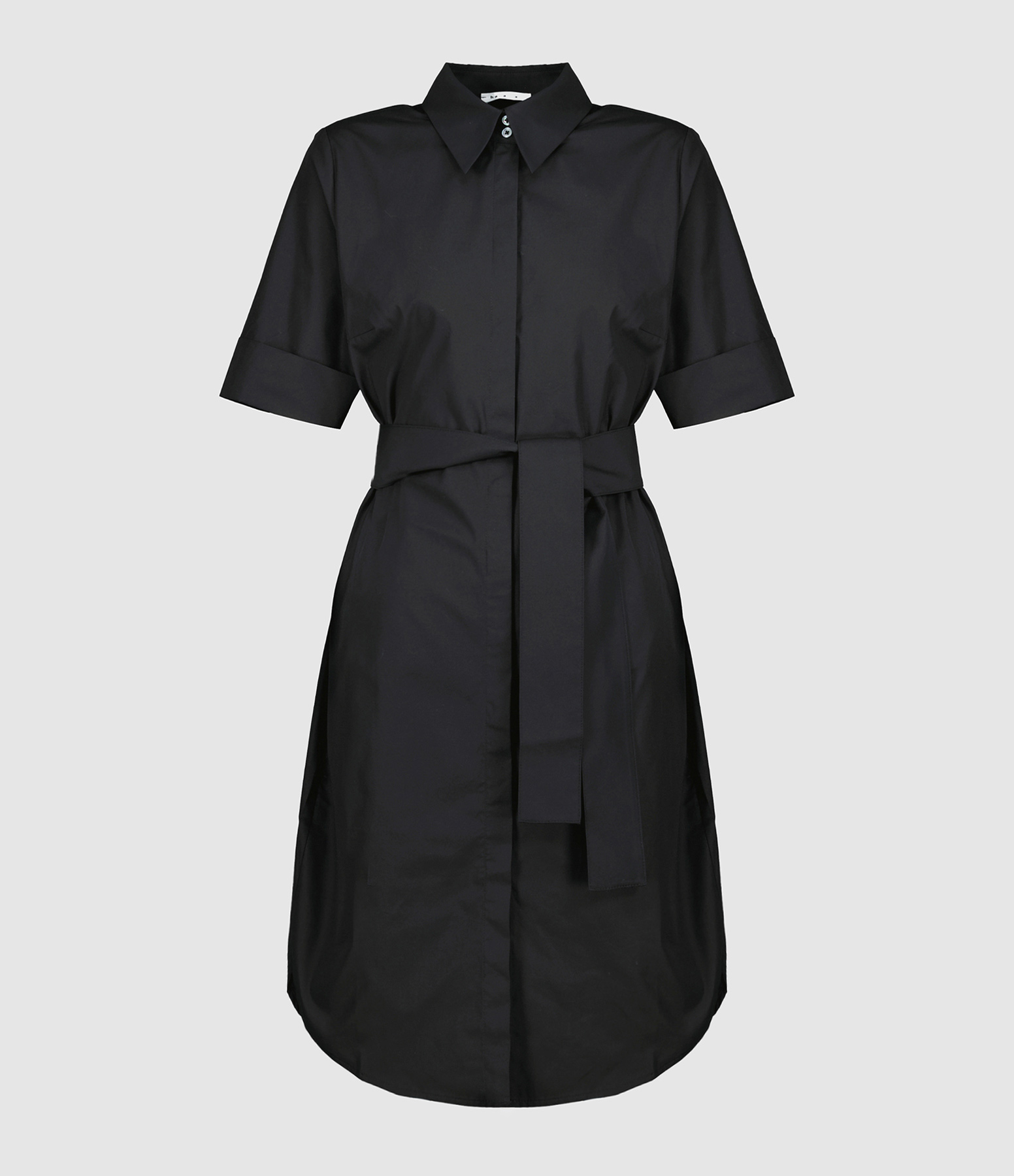 Robe longue type chemise en coton noir. Manches courtes. Col chemise. Patte de boutonnage à l'intérieur. Ceinture au niveau de la taille. Deux poches dissimulées dans les coutures. Coupe droite. Base arrondie.