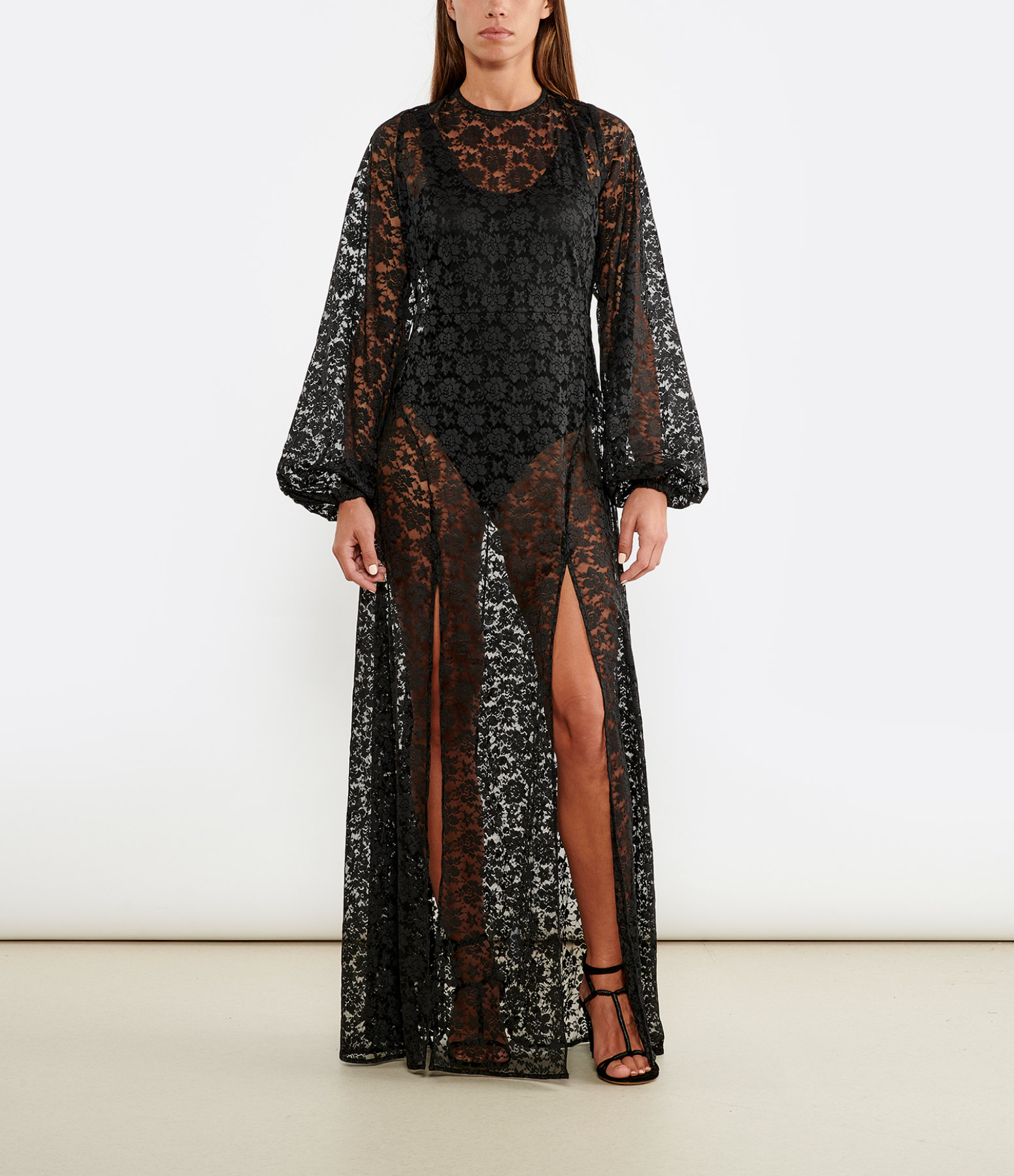 Robe longue en dentelle fleurie noire. Col rond fermé par un cordon dans le dos. Dos nu. Manches longues bouffantes élastiquées aux poignets. Coupe ajustée. Base droite fendue sur les cotés. Body noir inclus.