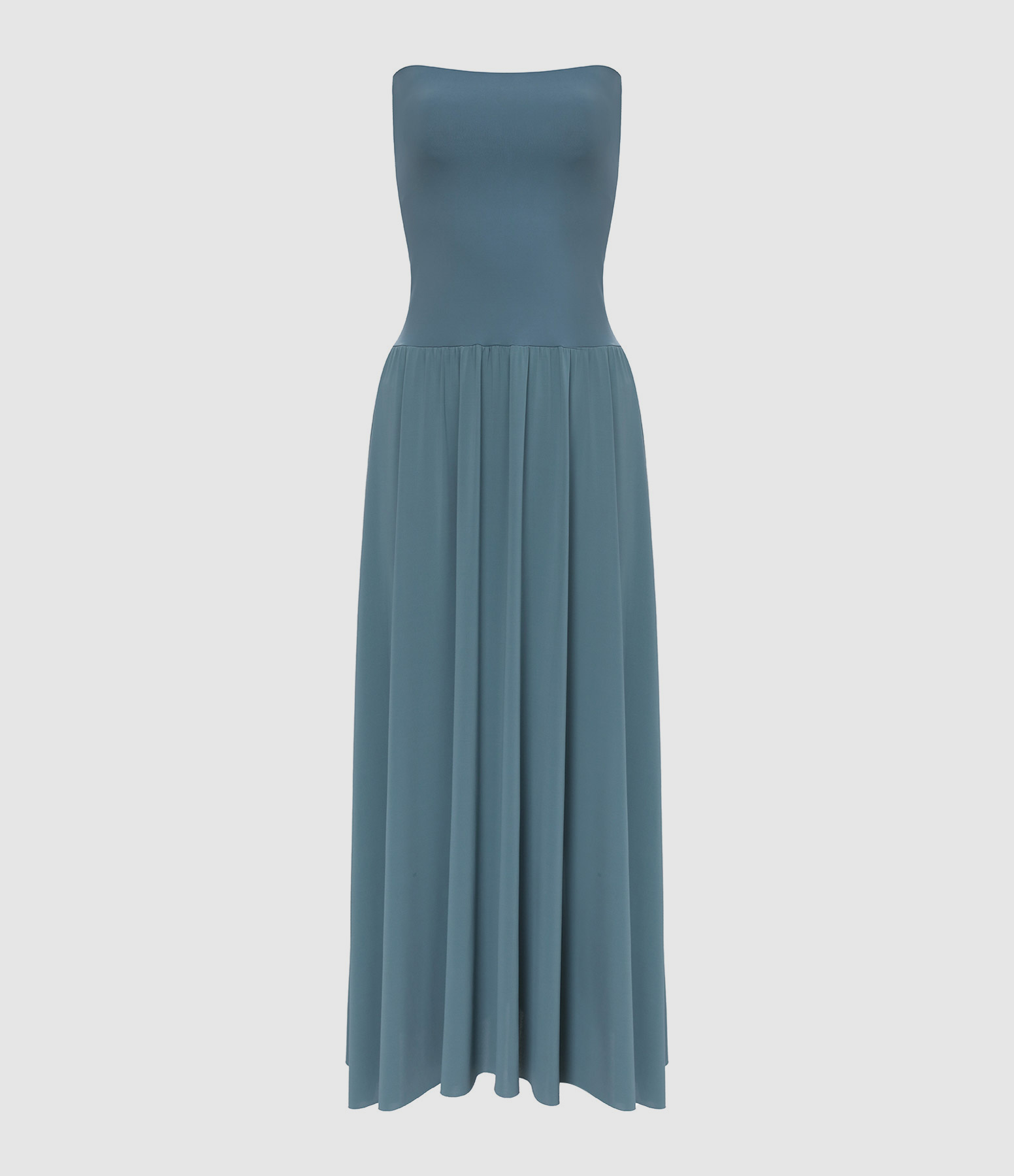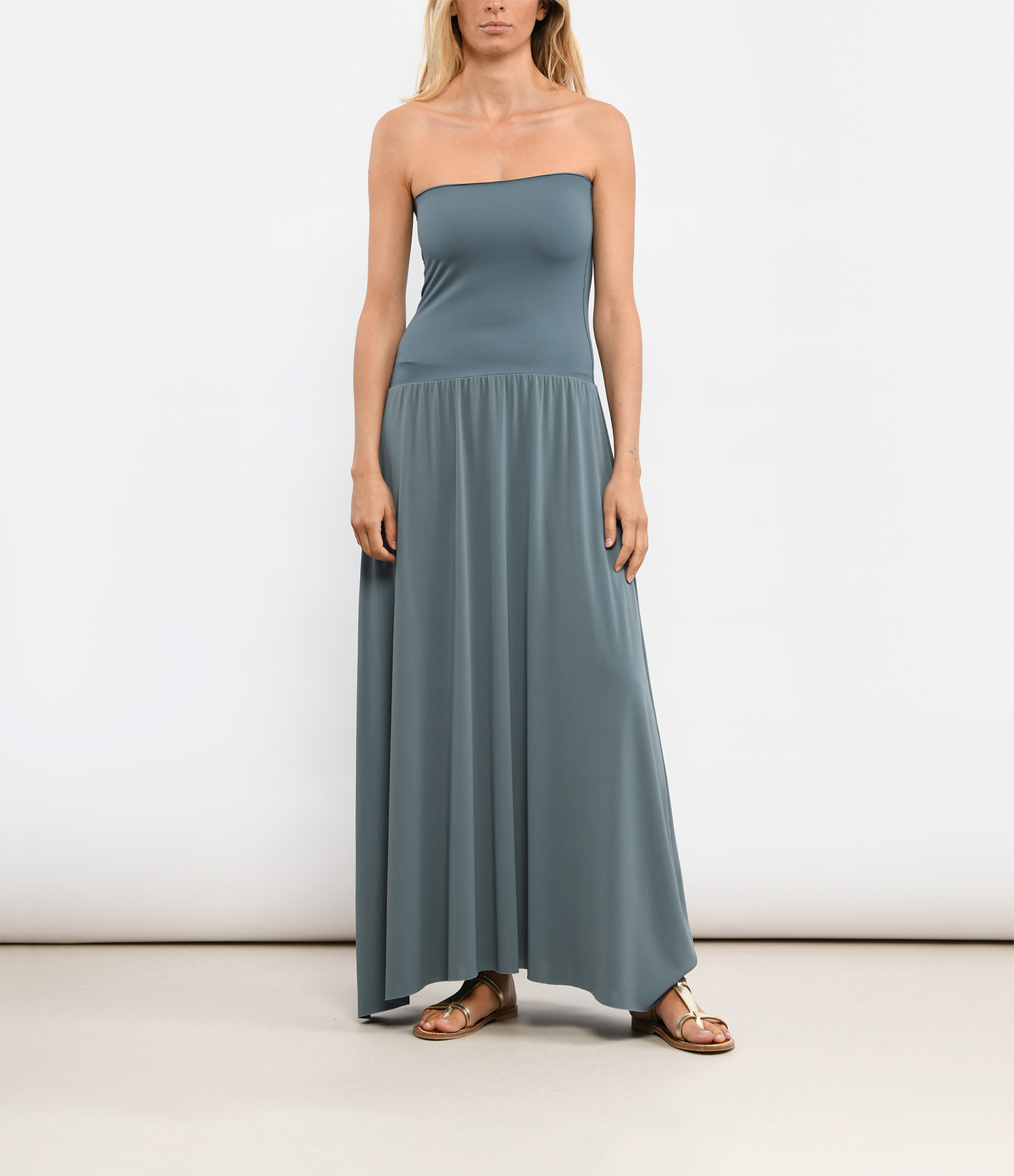 Robe longue bustier bleue. Matière extensible. Coupe droite. Base droite.
