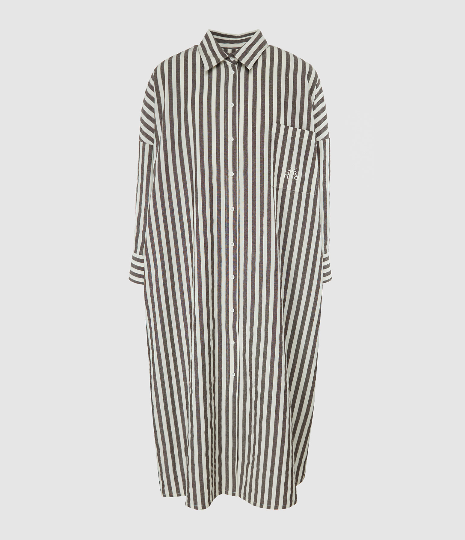 Robe chemise longue en coton, rayures noires et blanches. Col chemise. Manches longues resserrées et boutonnées aux poignets. Poche plaquée, avec logo bordé ton sur ton. Coupe large. Base droite.