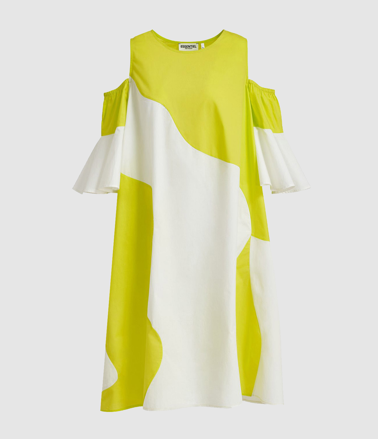 Robe mi-longue jaune fluo et blanche. Epaules dénudées. Col rond. Manches courtes à volants. Coupe large. Base droite.