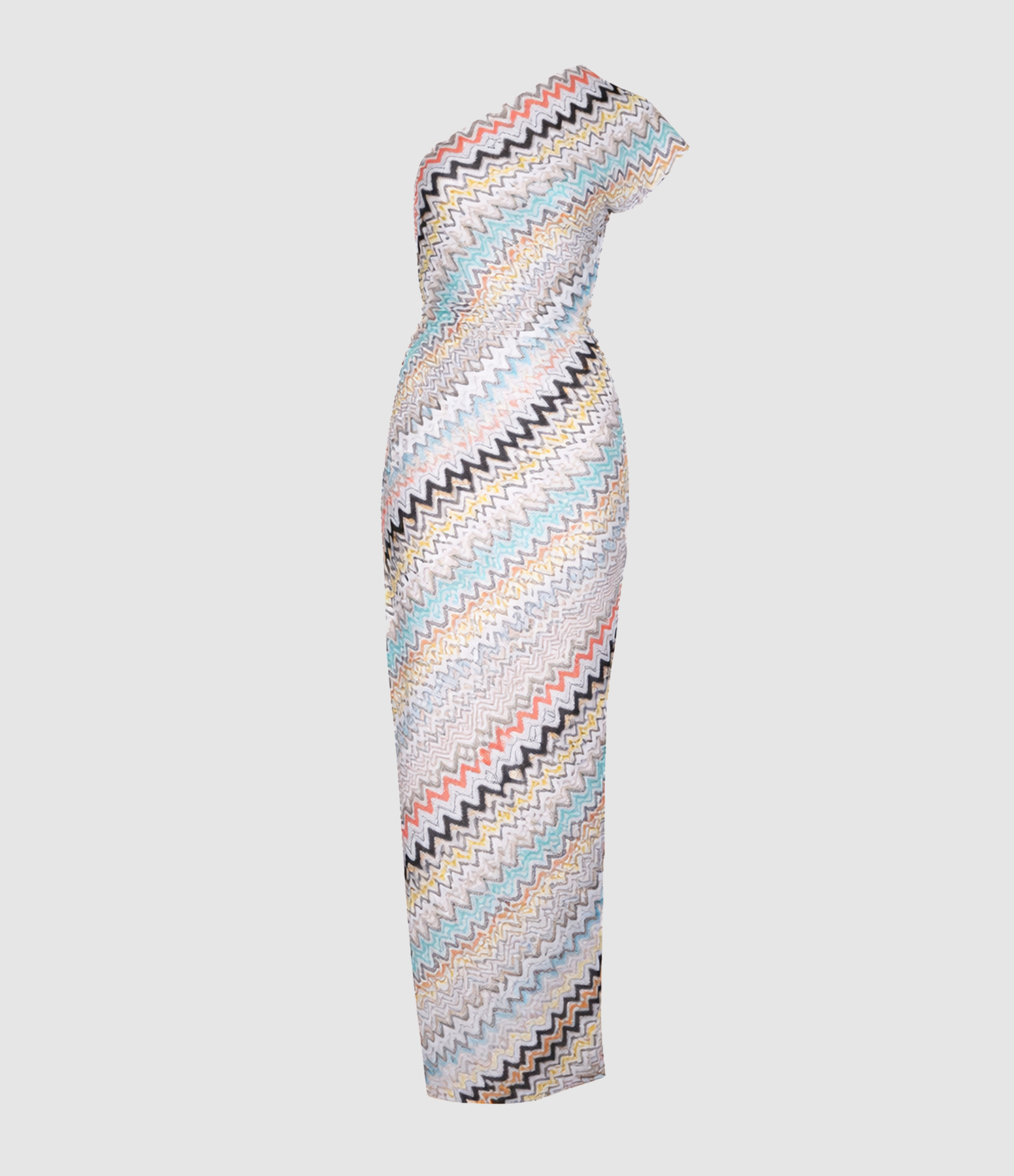 Robe longue asymétrique en viscose lamée chevron. Motif en dentelle zigzag. Fronces latérales.