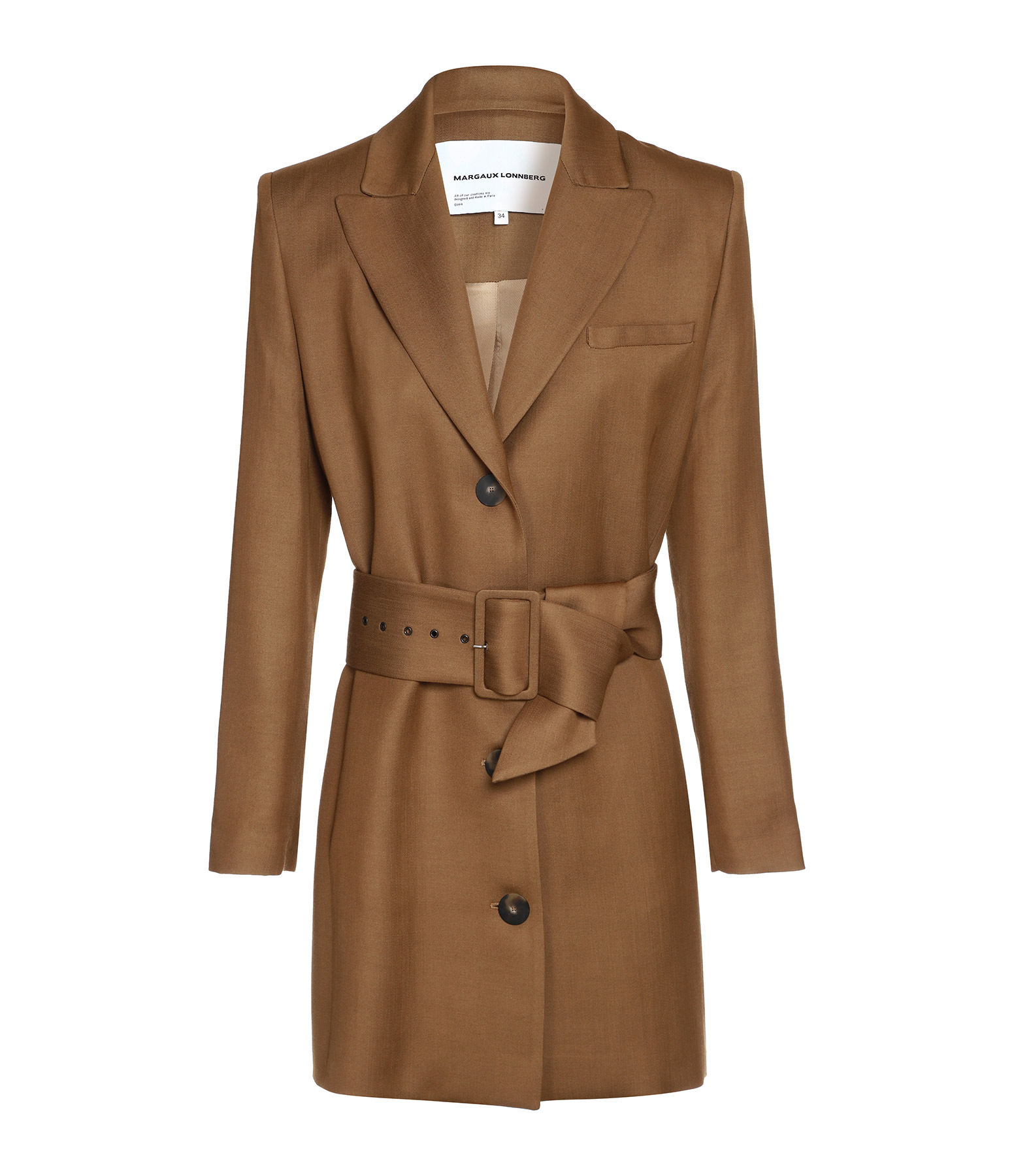 Robe en laine coupe blazer pour femme. Ceinture amovible. Col tailleur. Manches longues. Deux poches fendues dans les coutures de côté et une poche poitrine. Fermeture par boutons. Base droite fendue au dos. Doublée.