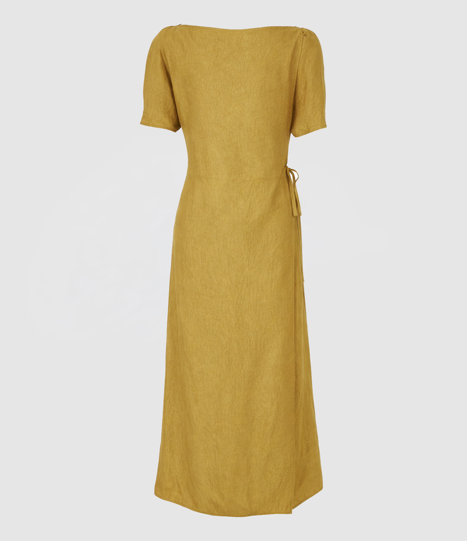 Robe portefeuille bronze. Épaules dénudées. Liens à nouer.