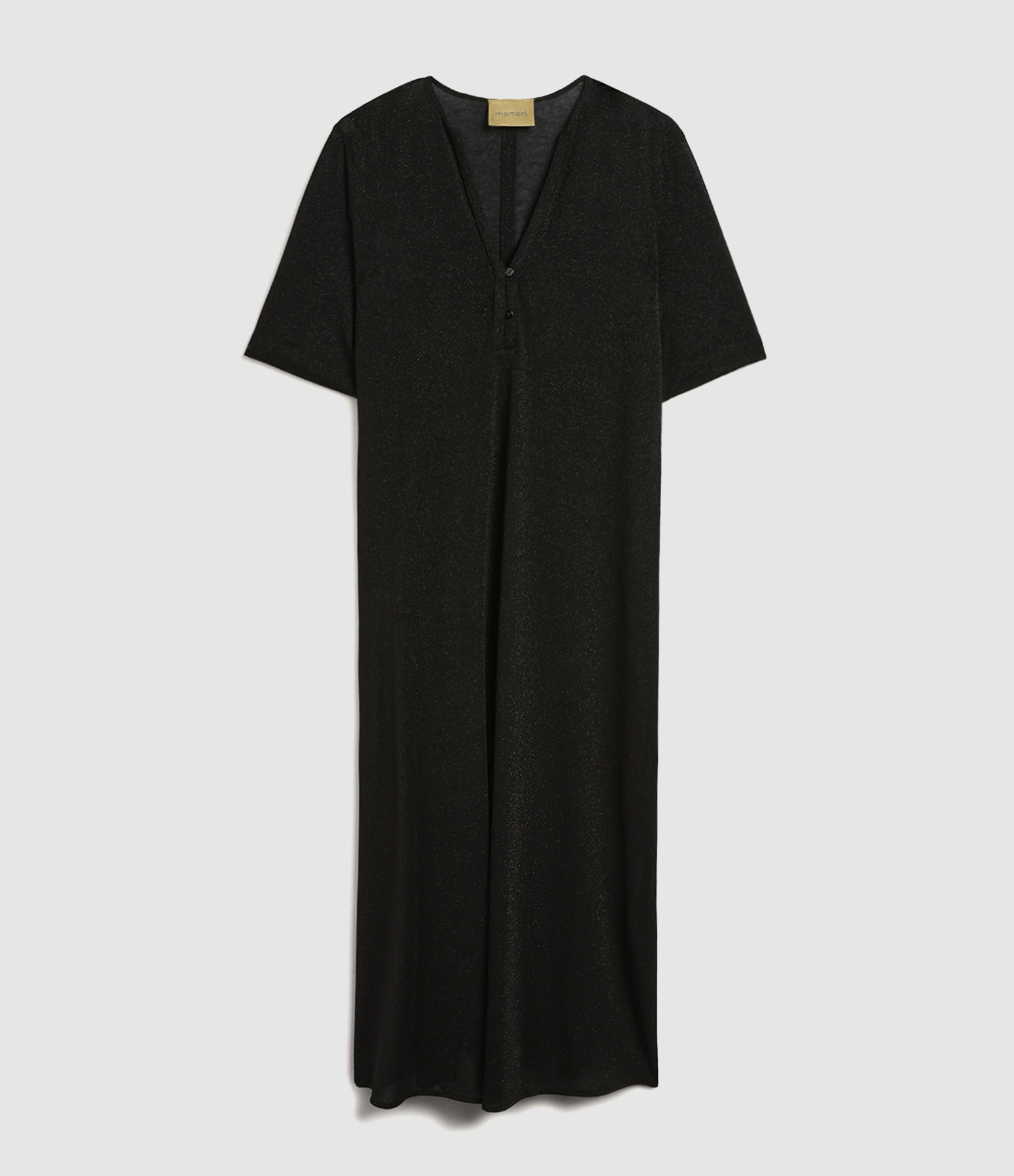 Robe tunique longue à paillettes, manches courtes, deux poches latérales, encolure en V ornée d’une fine patte boutonnée, longueur au-dessus de la cheville.