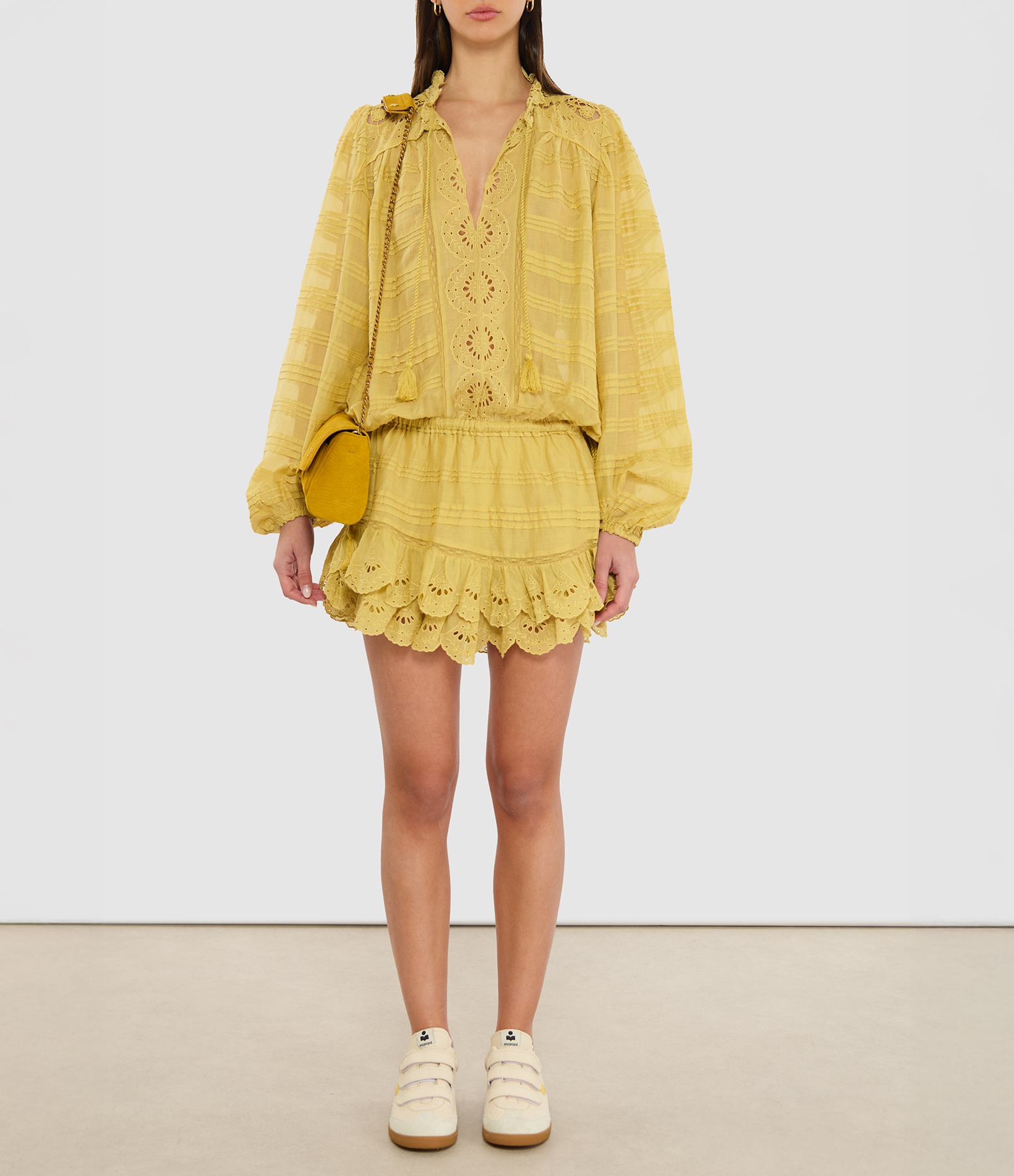 Robe courte volantée en organique coton et dentelle fleurie. Col rond Encolure tunisienne avec cordons terminés par des pompons, à nouer. Manches longues avec poignets élastiqués. Taille élastique avec cordons terminés par des pompons