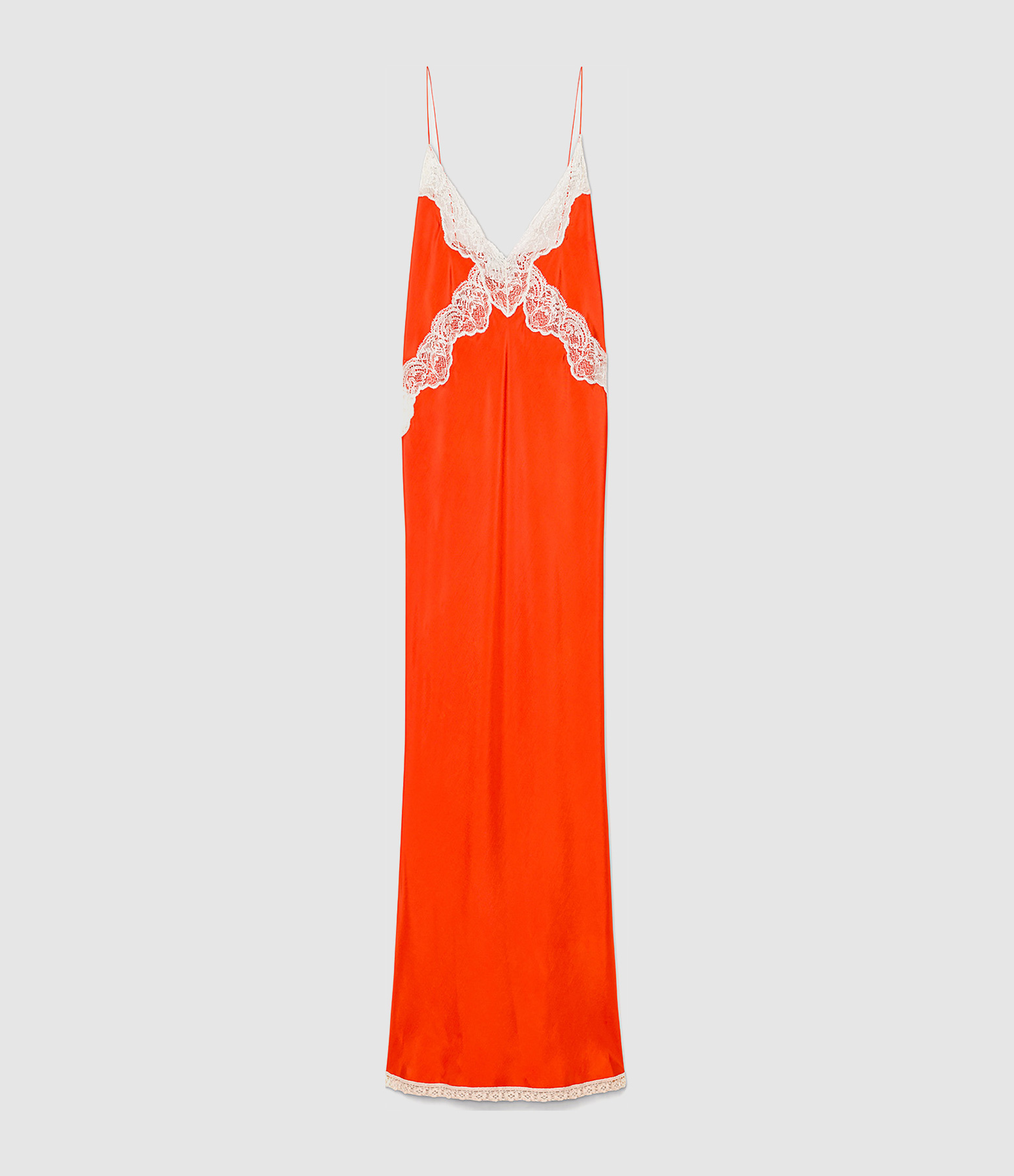 Robe fluide, ornée d’incrustations de dentelle et d’un buste en sergé de pure viscose. Coupe droite.