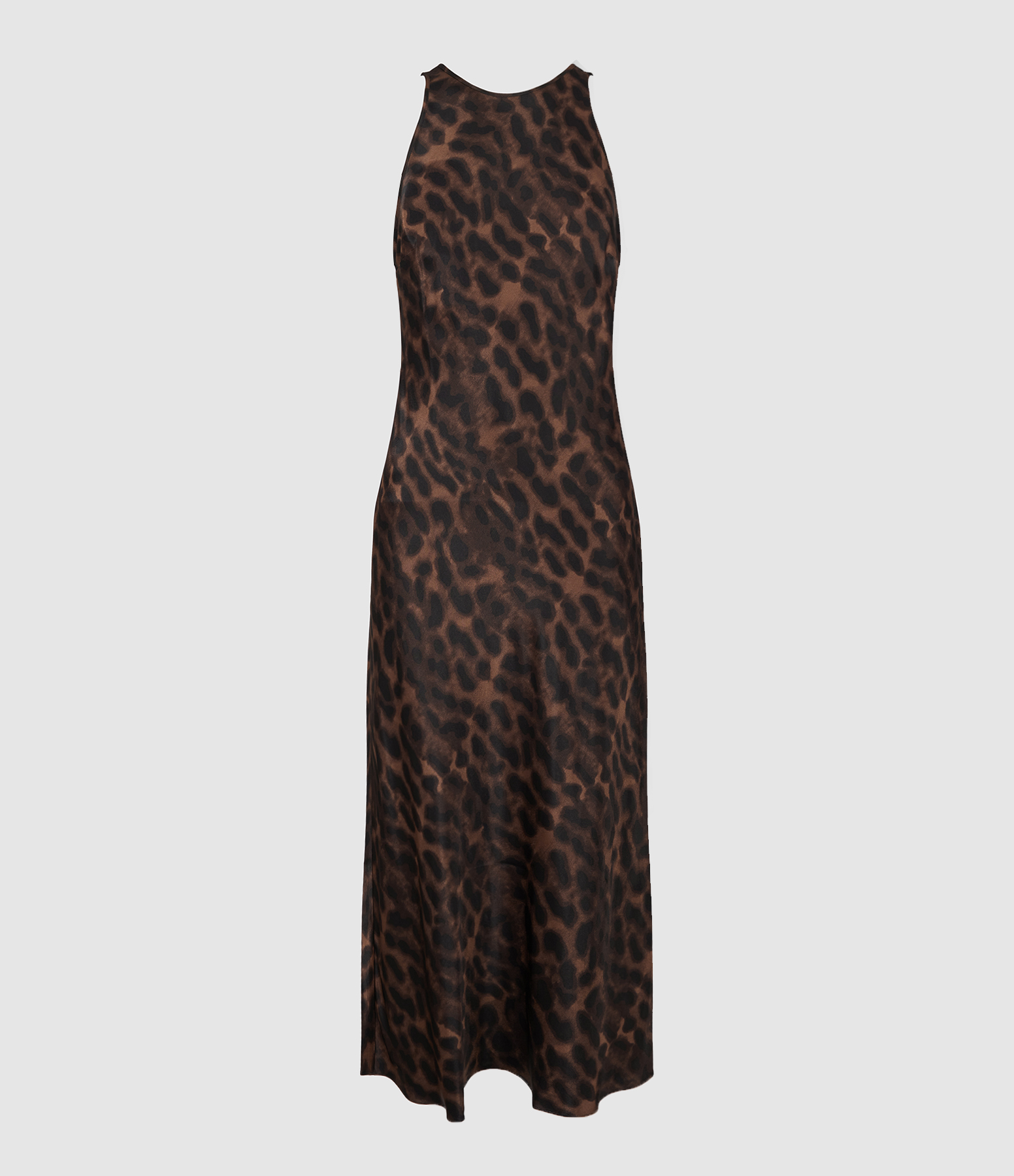 Robe mi-mollet en crêpe de satin léger. Imprimé léopard.