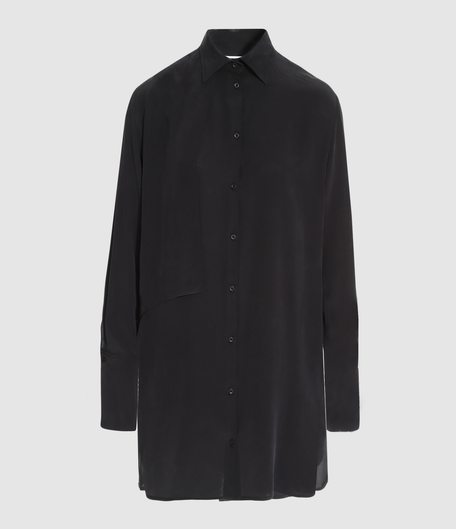 Robe chemise mi-longue en coton noir. Col chemise. Manches longues avec fentes et poignets boutonnés. Logo brodé ton sur ton sur le poignet gauche. Fermeture boutonnée sur le devant. Petits boutons noirs. Empiècement de tissu sur la partie droite du devant de la robe. Pli creux dans le dos. Fentes latérales. Coupe droite. Base arrondie. Non doublée.