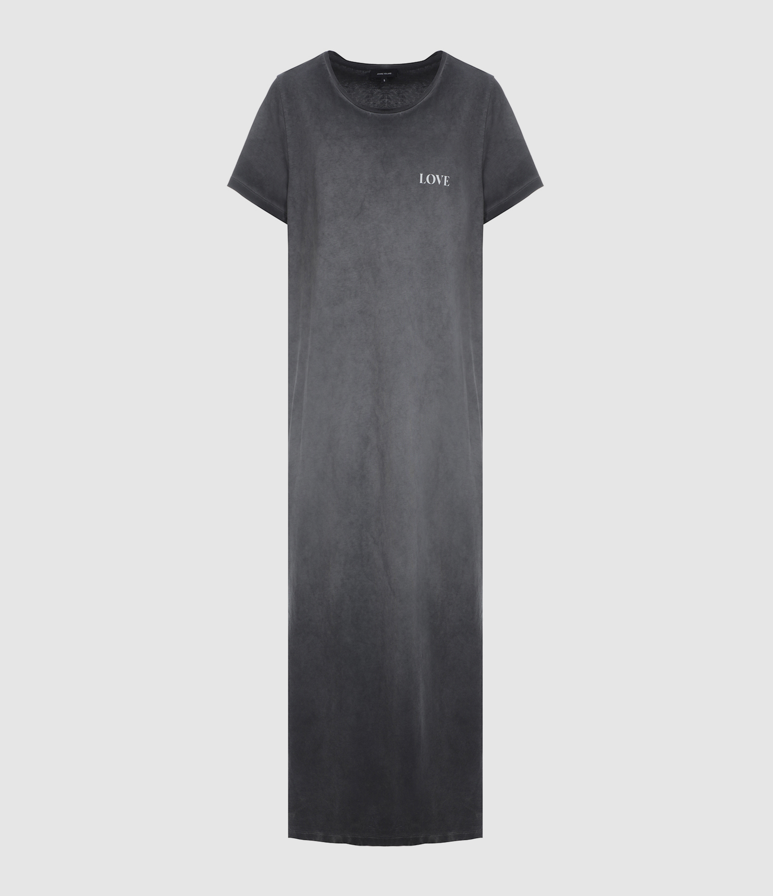 Robe longue tee shirt en coton gris effet délavé. Col rond. Manches courtes. Inscription blanche "LOVE" floquée côté cœur. Fentes sur les côtés. Coupe droite. Base droite. Non doublée.