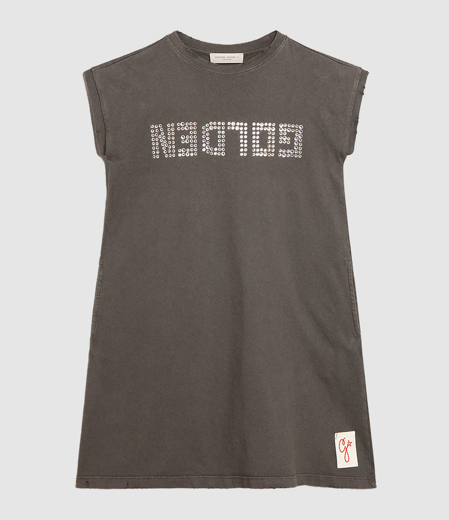 Robe tee-shirt en jersey de coton anthracite avec l'inscription GOLDEN en strass sur le devant. Col rond. Manches courtes. Patch amovible avec la lettre G brodée en rouge sur le devant. Coupe droite. Base droite.