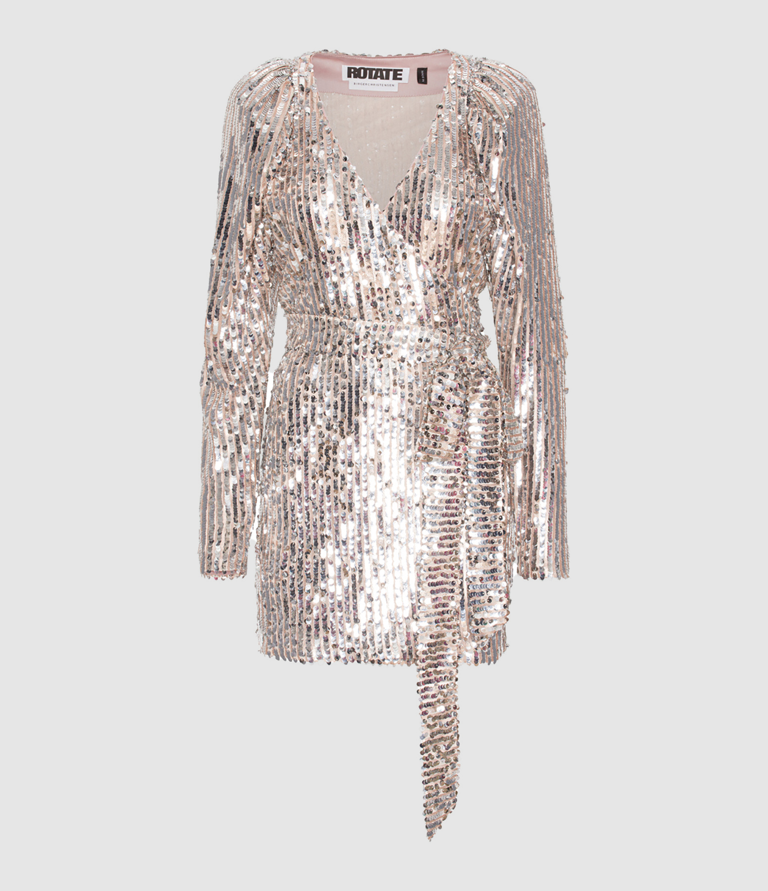 Robe courte en sequins argentés. Col en V croisé. Épaulettes. Manches longues. Coupe portefeuille. Ceinture assortie amovible à nouer pour une coupe plus ajustée. Base droite. Doublée.