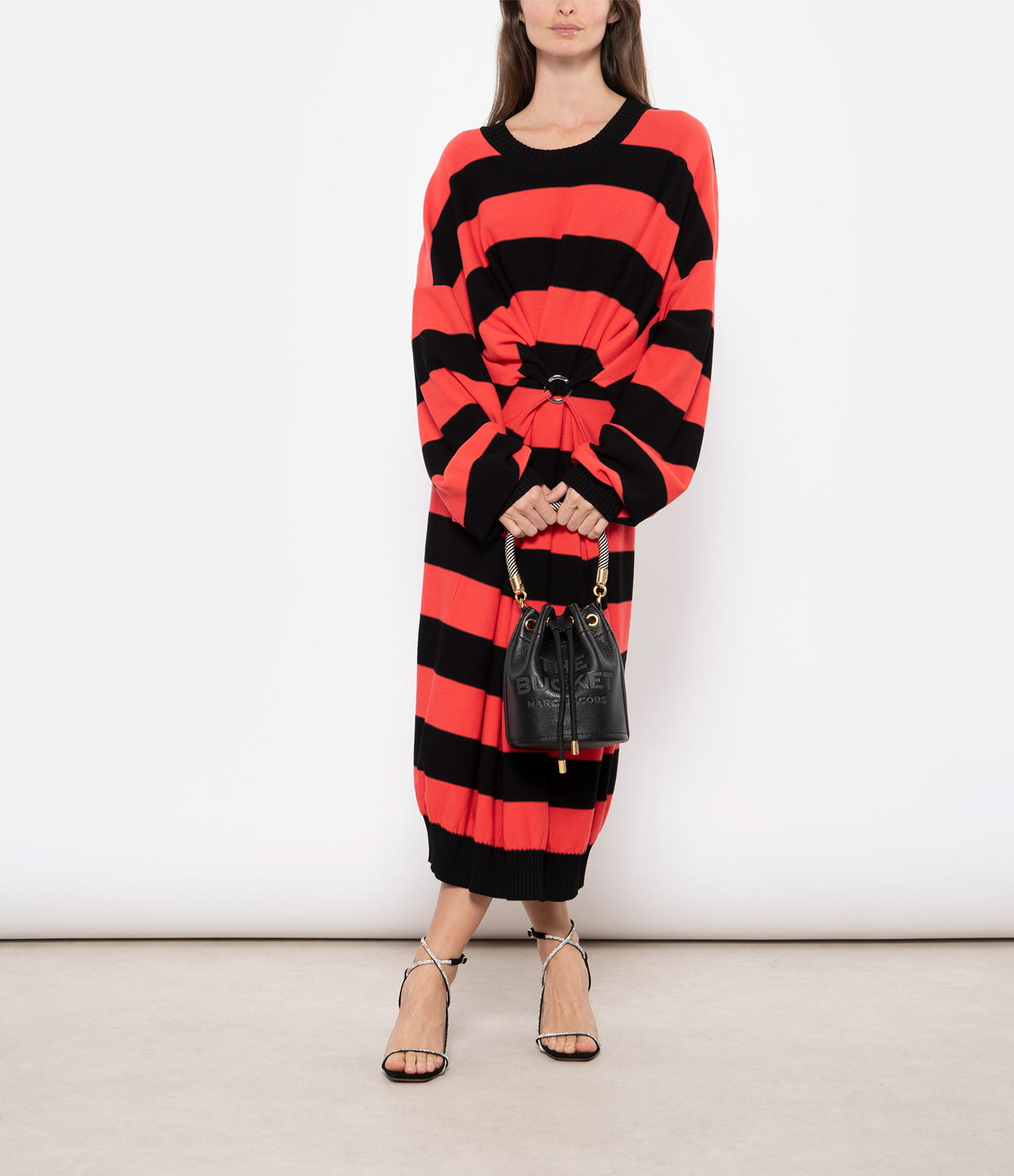 Robe longue en coton rouge. Rayures noires. Resserrée à la taille par un anneau amovible. Col rond. Manches longues. Bords côtelés. Coupe droite. Base droite.