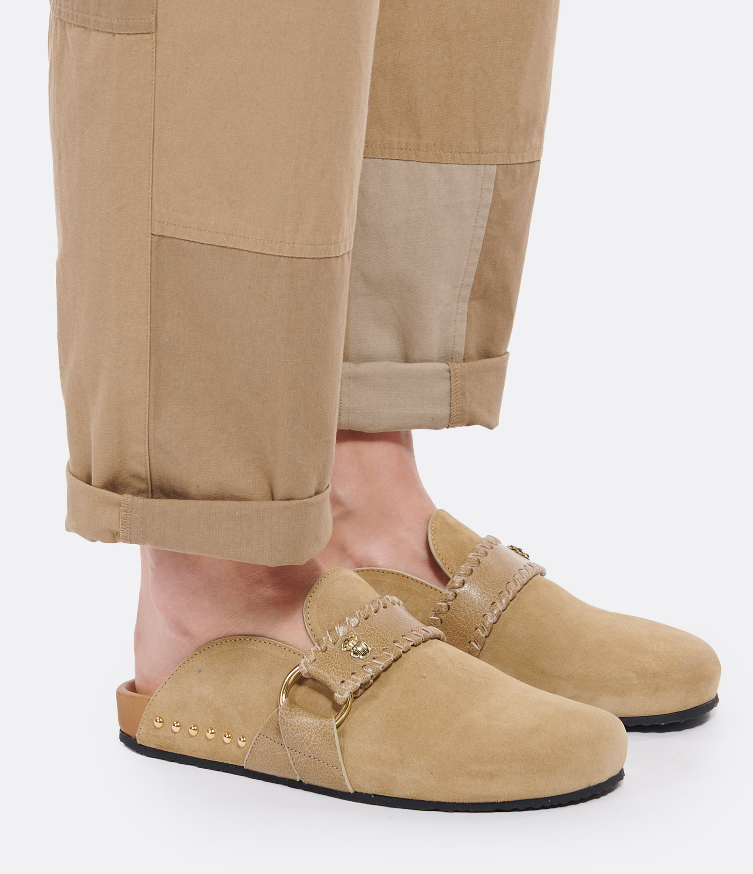 Sabots en cuir suédé beige, entièrement doublées de cuir. Une bride en cuir suédé beige avec scarabée dorée et boucle métallique doré. Bouts ronds.