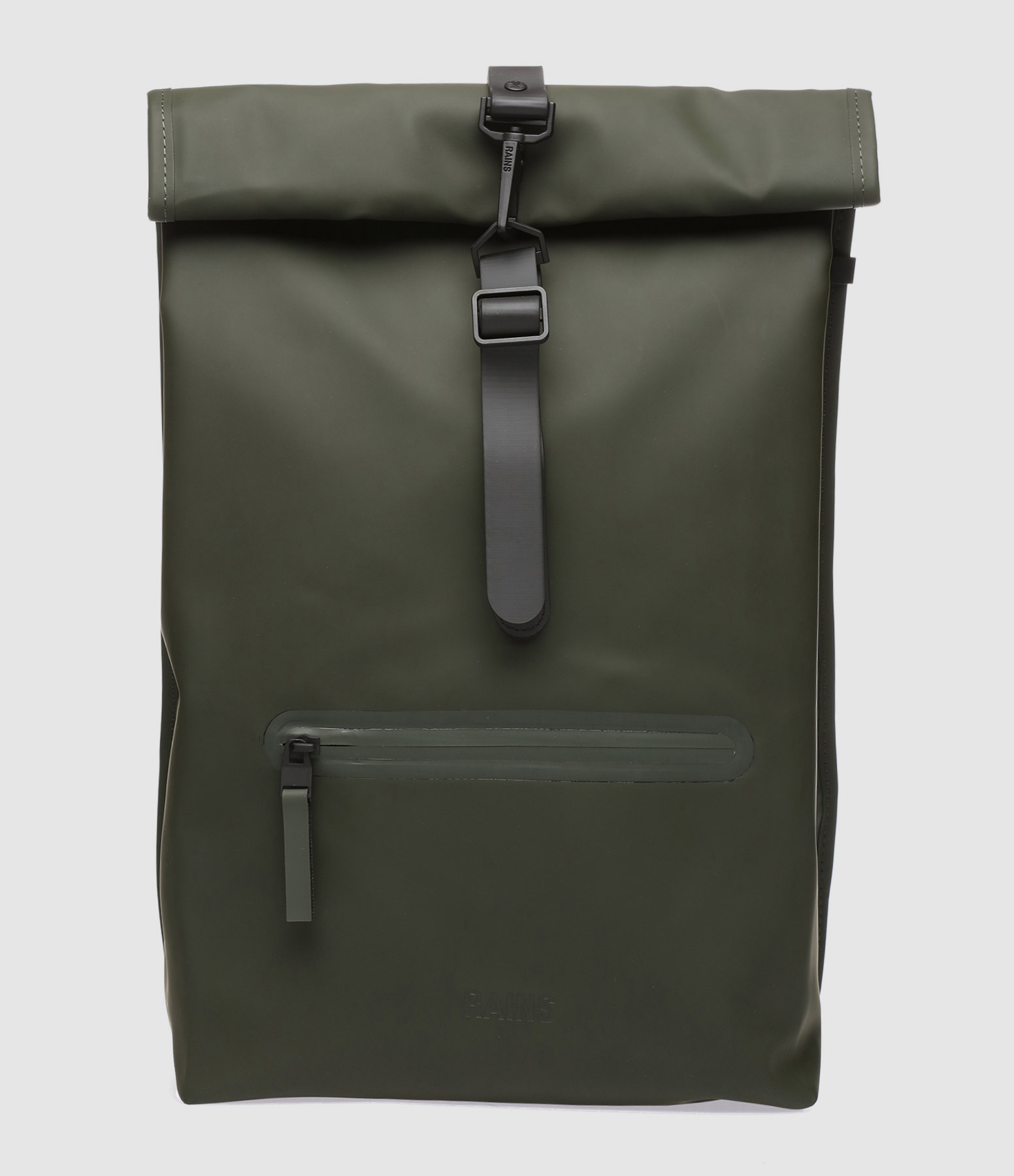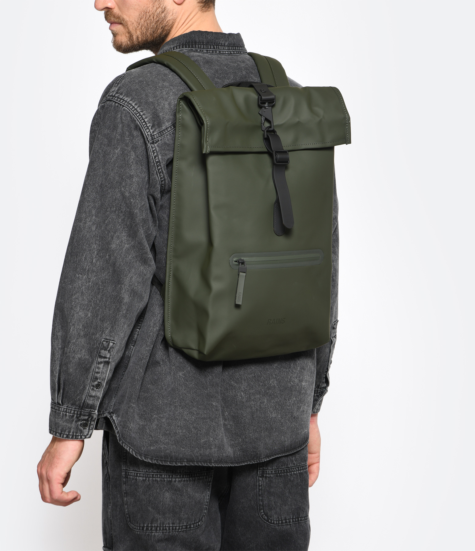 Sac à dos imperméable vert. Ouverture à rouler avec bouton pression. Fermeture à mousqueton. Une poche avant avec fermeture zippée. Pan dorsal matelassé en mailles. Poche latérale pour ordinateur portable 16". Bretelles matelassées réglables. Poignée de transport en toile. Sangle verticale ajustable.