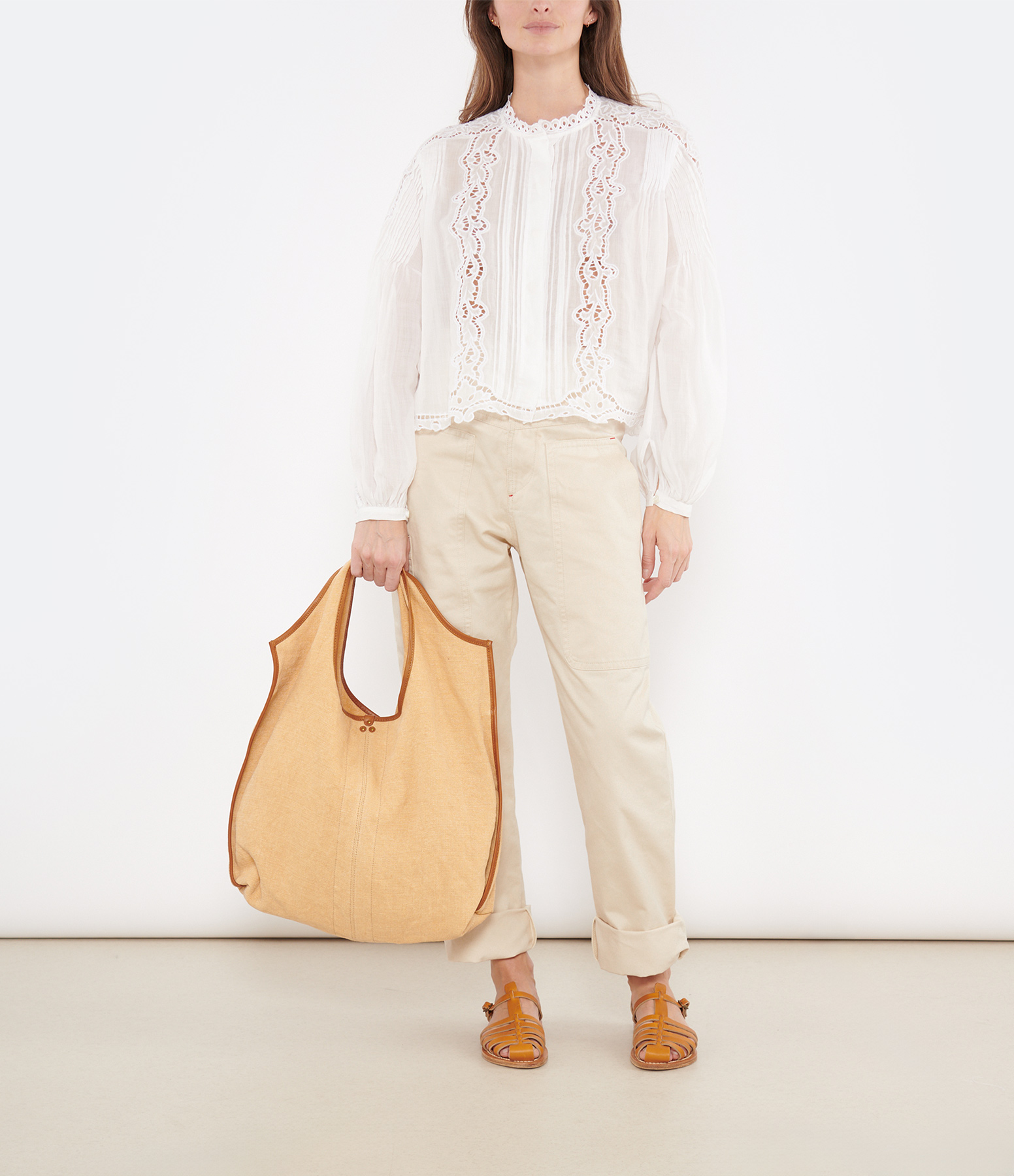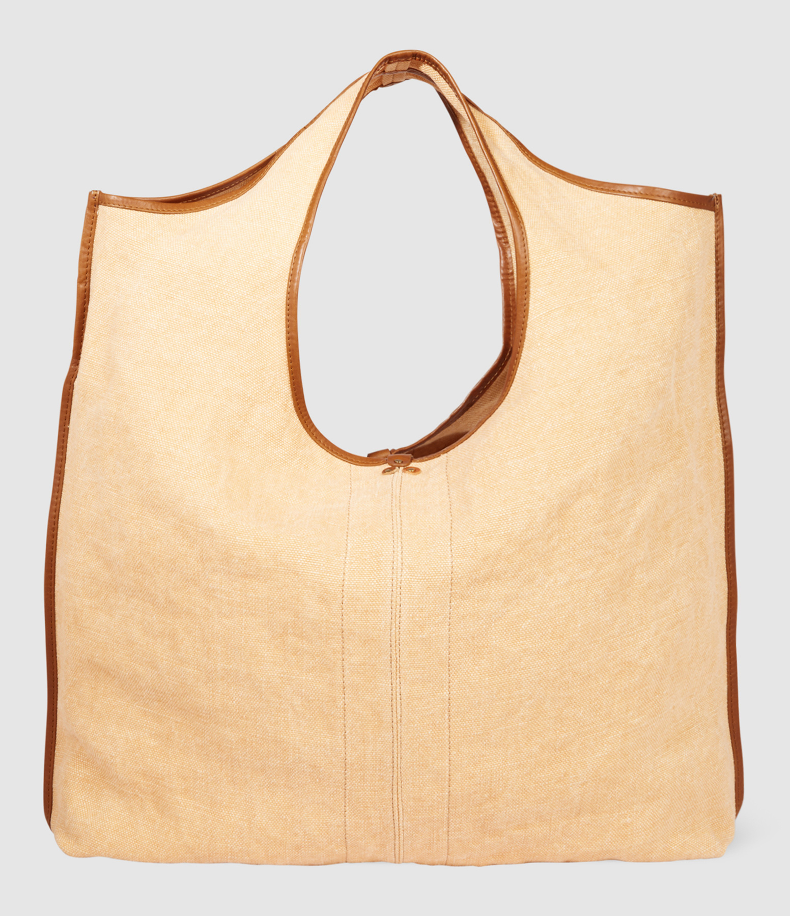 Tote bag souple en lin beige aux anses rondes qui se porte à l'épaule.