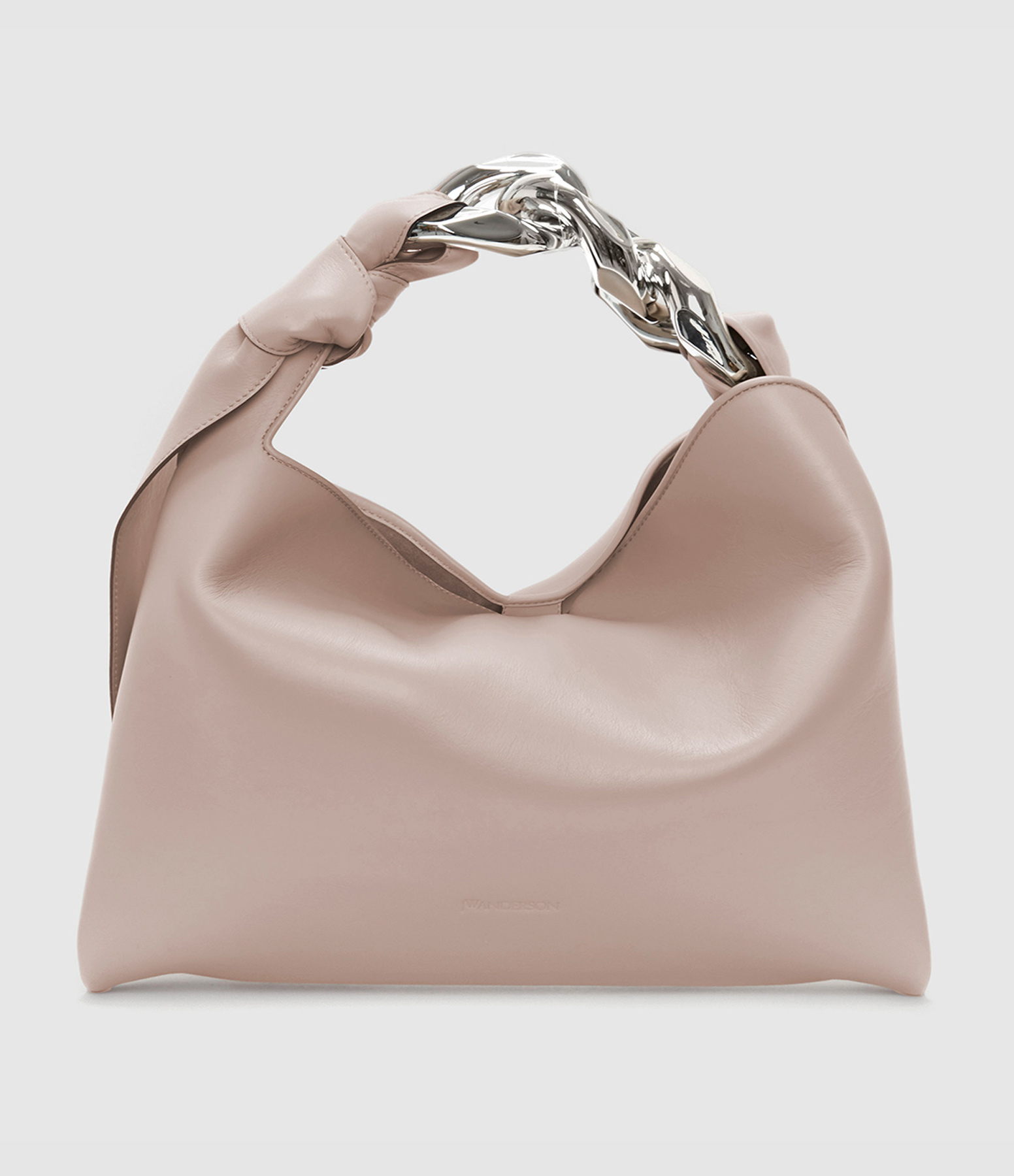 Sac à main en cuir taupe. Bandoulière à 3 grands maillons de chaîne argentés. Détail de nœud réglable sur un côté de la chaîne. Logo embossé sur le panneau avant ton sur ton. Fermeture magnétique. Doublure en daim. Grand compartiment principal. Peut être porté à l'épaule ou comme sac à poignée supérieure.