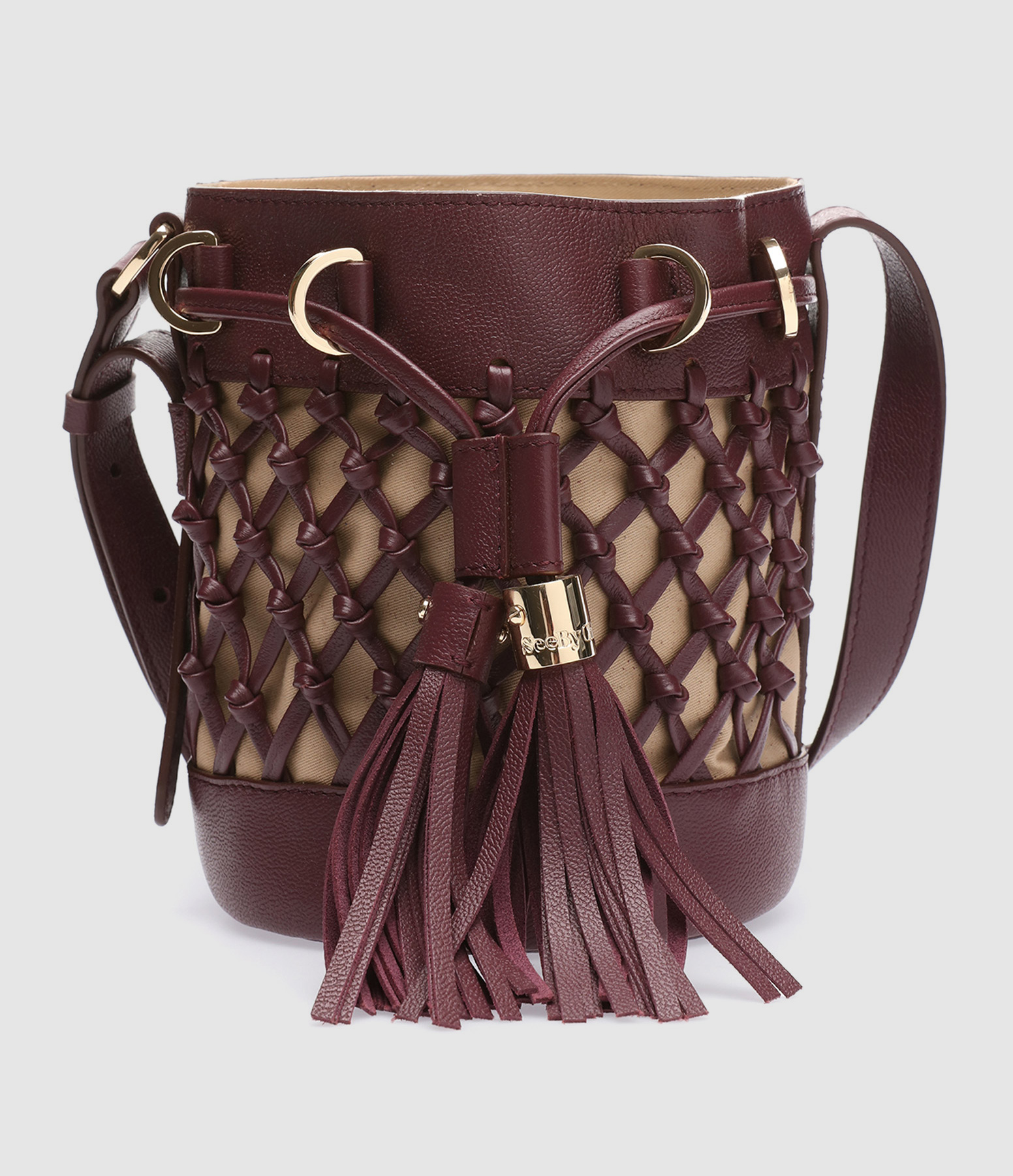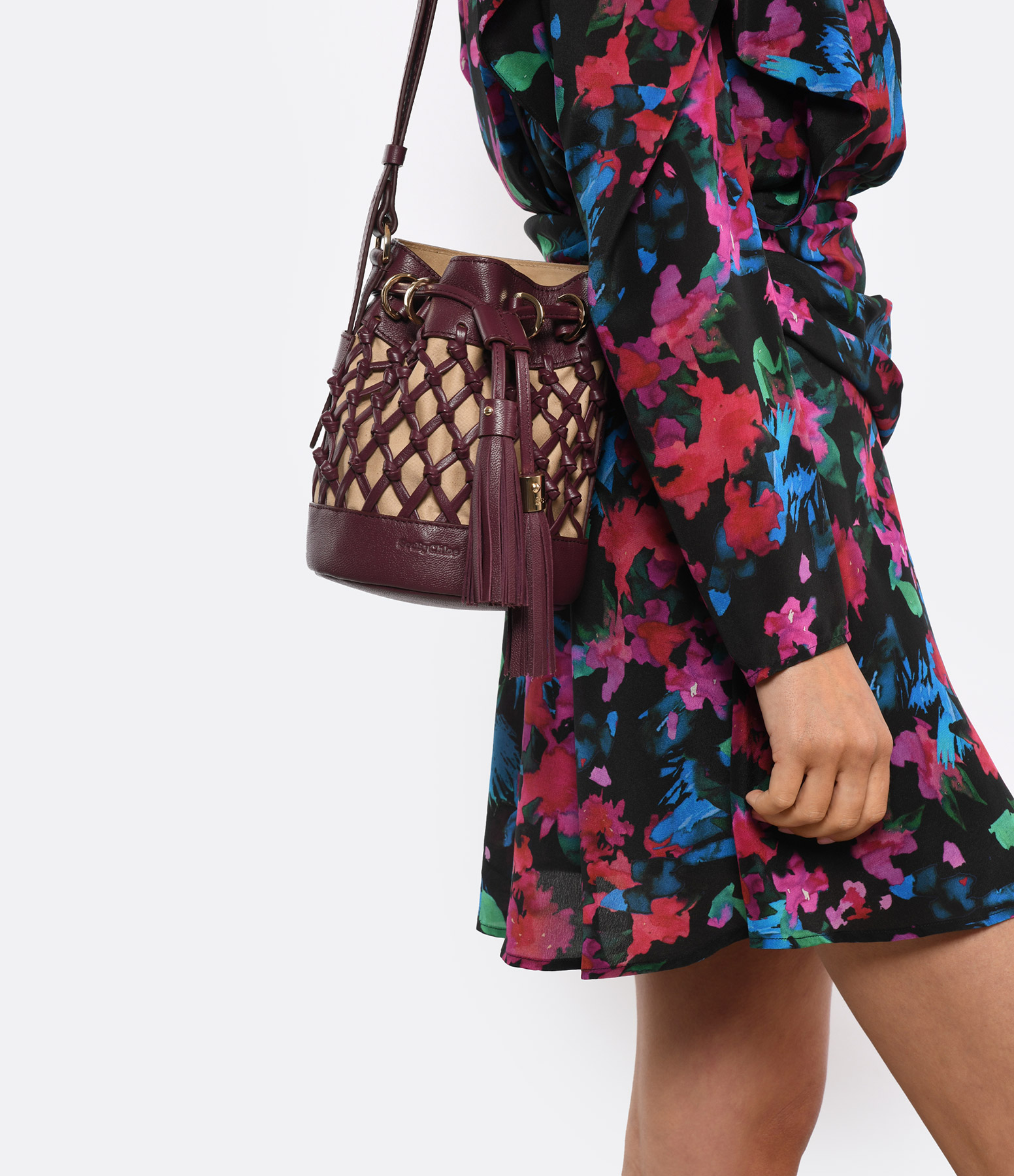 Sac seau en cuir violet. Tressé sur le devant. Une grande bandoulière. Deux pompons sur l'avant. Doublé en coton.