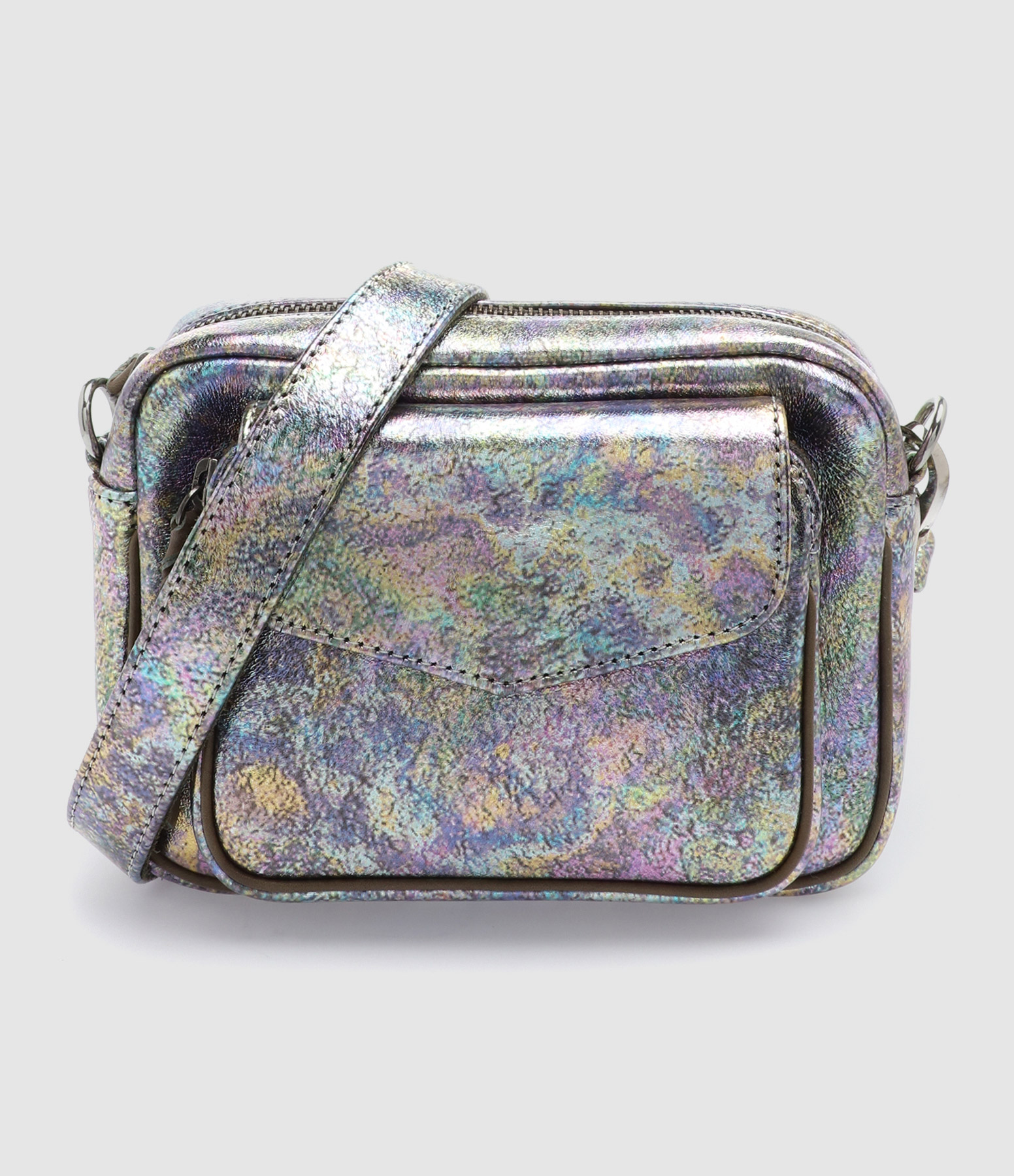 Sac en cuir lisse métallisé multicolore. Deux compartiments. Fermeture zippée et poche avant aimantée à rabat. Poche intérieure. Bandoulière amovible avec crochets et réglable doublée en cuir. Intérieur doublé en coton avec un poche zippée.