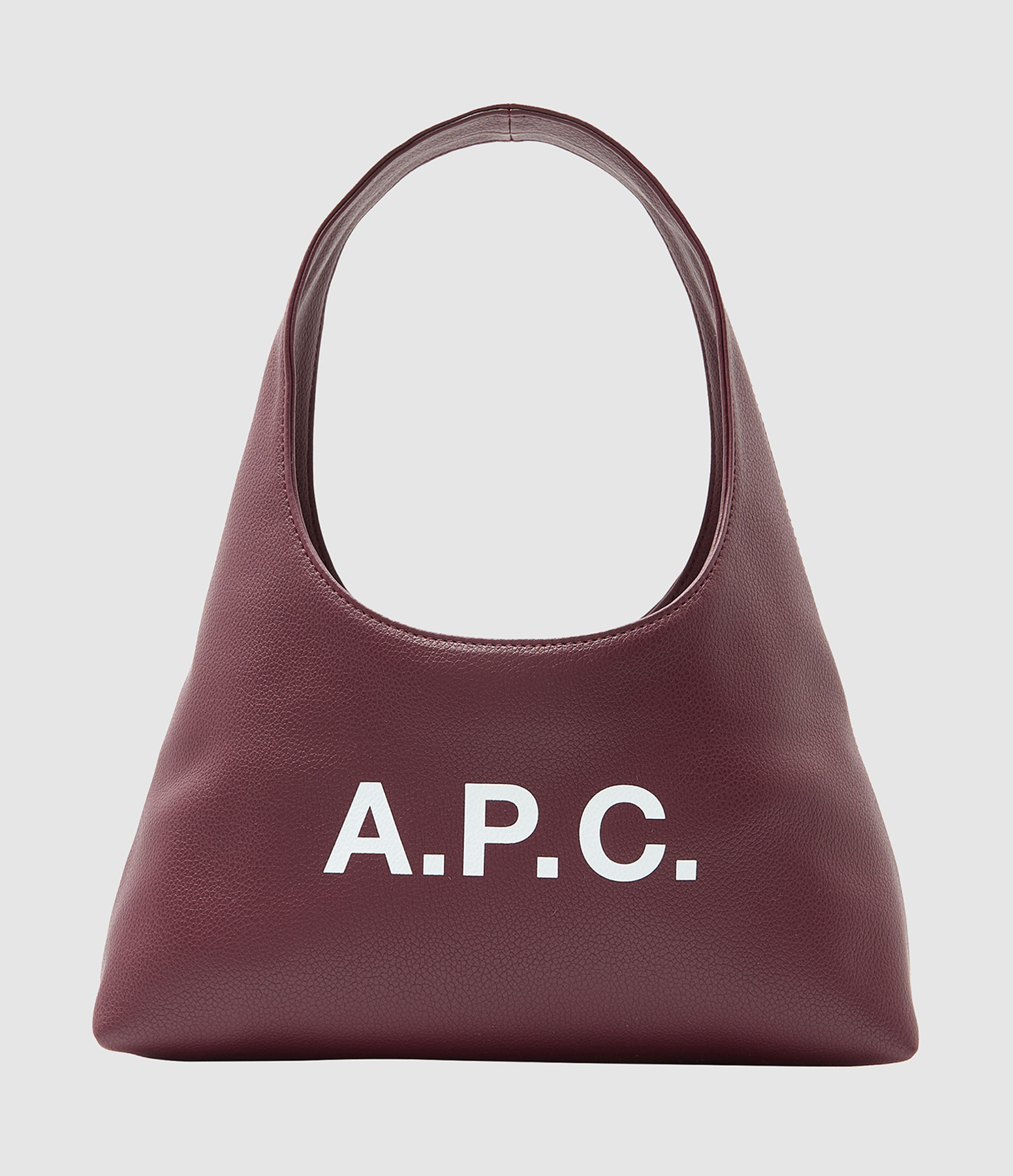 Sac épaule effet cuir bordeaux, en forme de demi lune. Logo "A.P.C" en lettre blanches sur le devant. Fermeture intérieur par deux aimants. Intérieur en toile avec une poche.