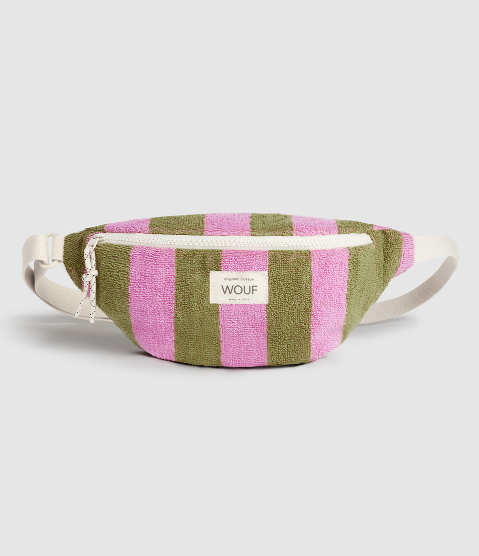 Banane bandoulière en éponge à rayures kaki et roses. Fermeture glissière YKK recyclée.