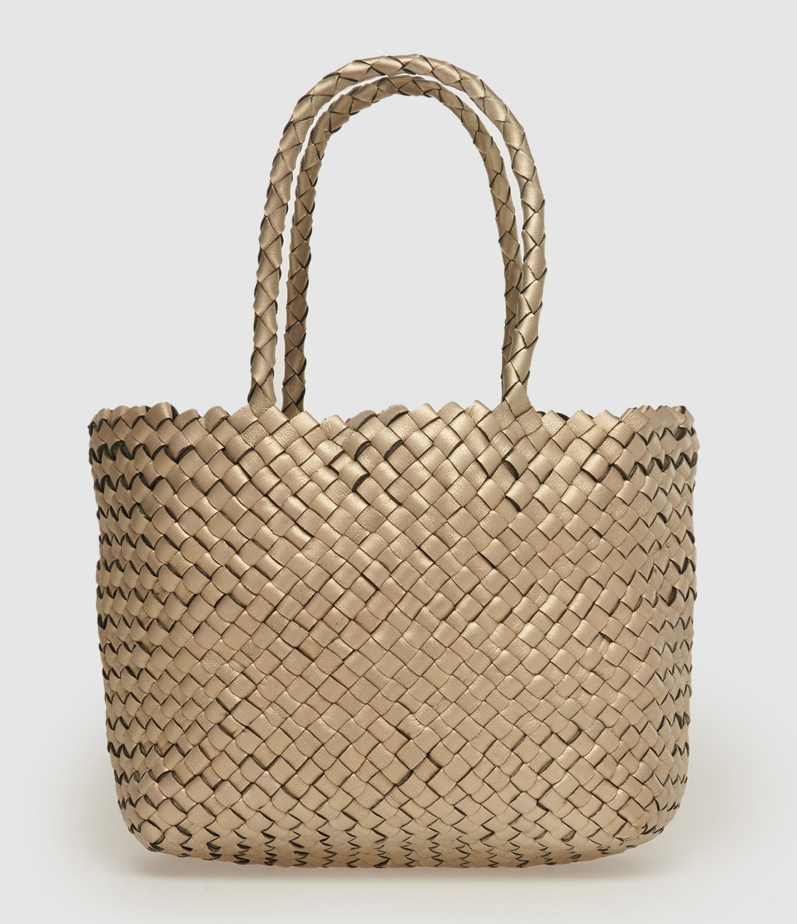 Petit sac en cuir tressé doré. Deux anses. Une bandoulière amovible réglable pour un porté épaule ou cross body. Finissions métalliques argentées. Un grand compartiment avec une petite pochette zippée amovible. Non doublé.