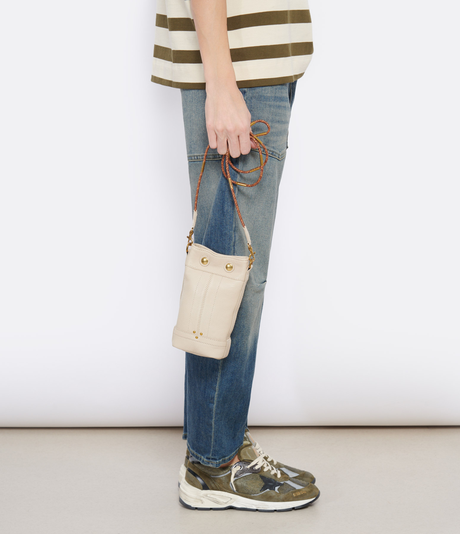 Micro sac en cuir grainé écru. Fermeture par bouton pression. Un lien tréssé en cuir, orné de bagues métalliques et amovible.