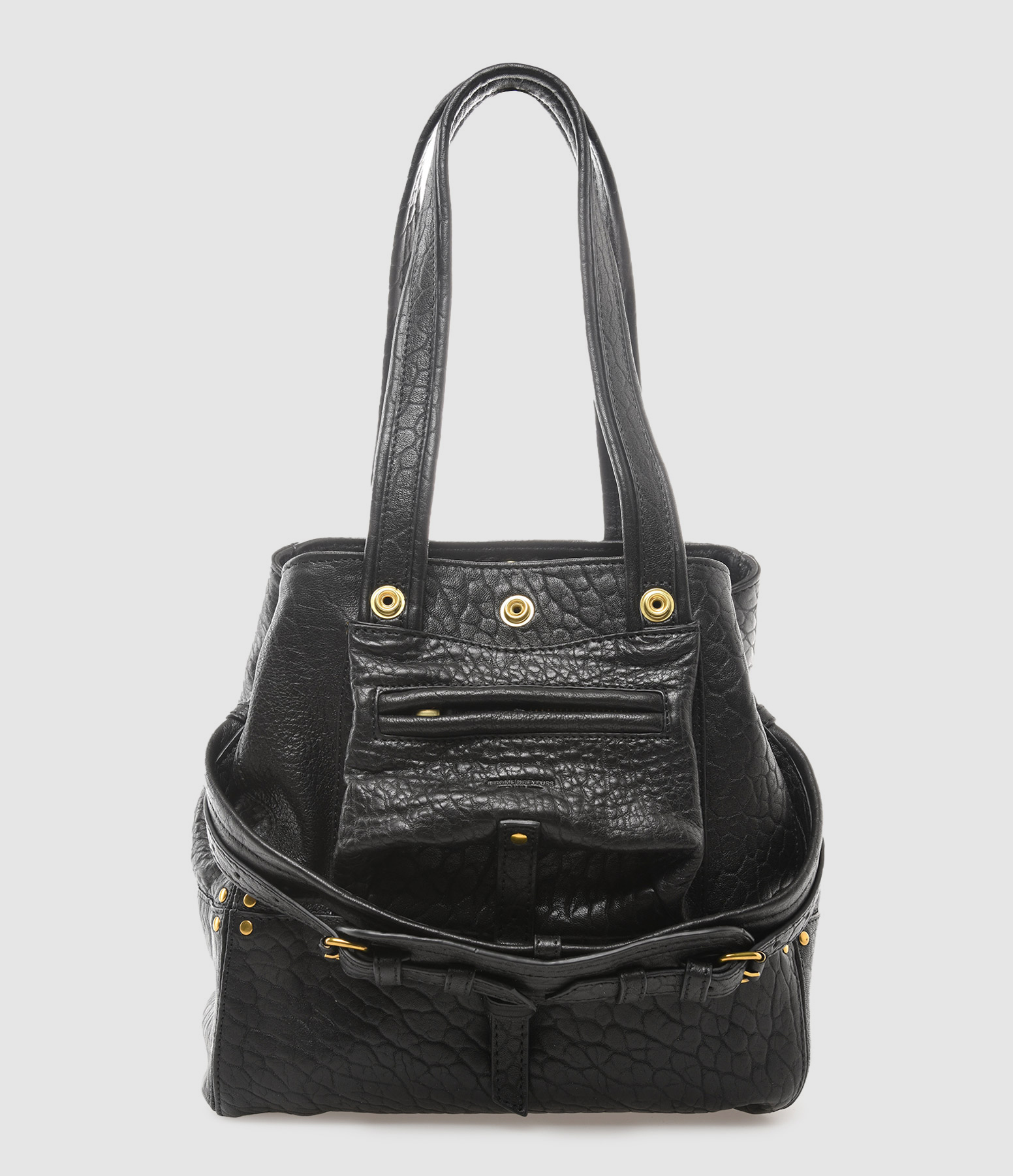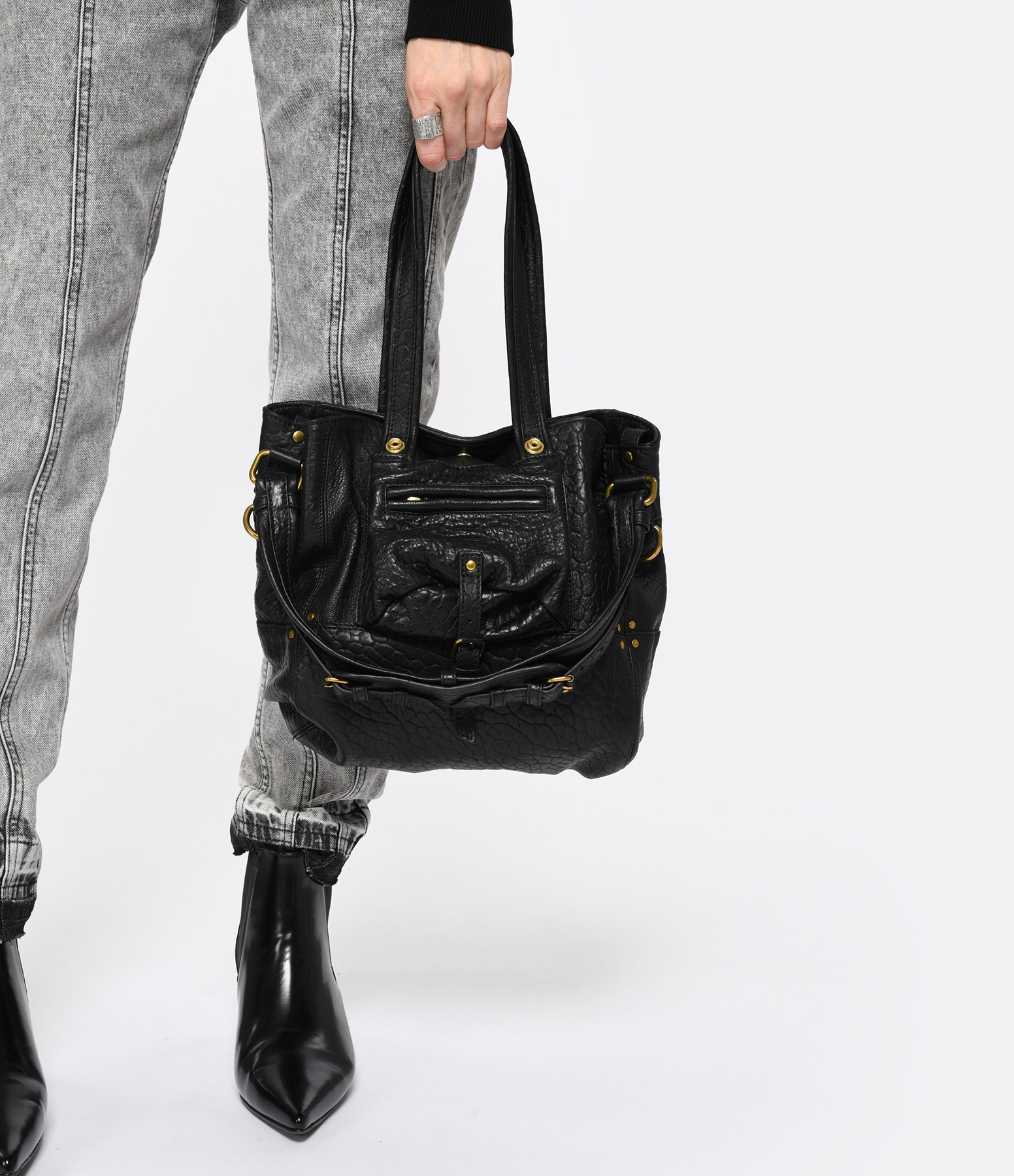Sac à main en cuir bubble noir avec une poche zippée sur l'avant. Deux anses et une bandoulière courte non ajustable. Fermeture par boutons pressions. Intérieur doublé en coton avec une poche plaquée.
