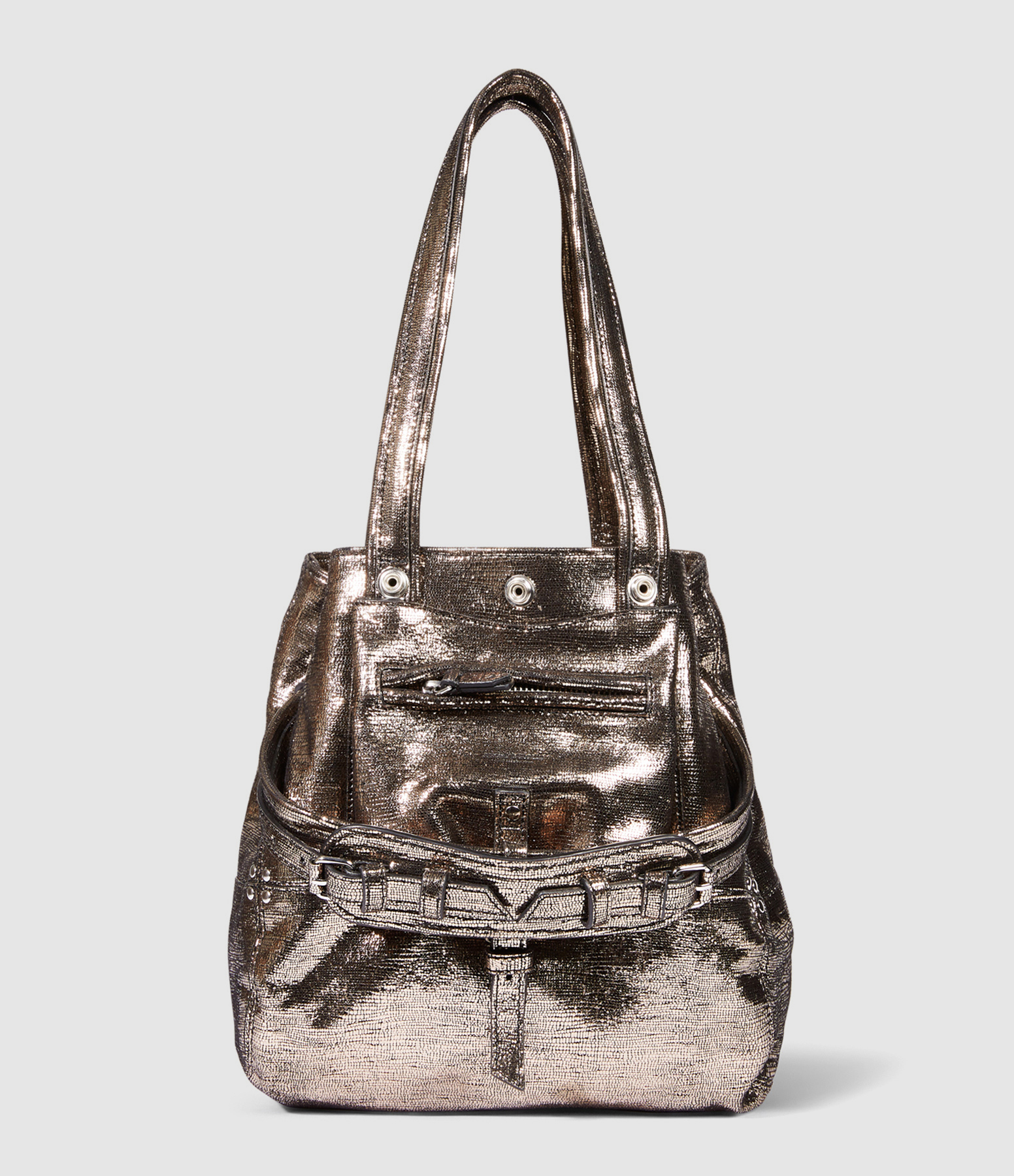 Sac à main en cuir lamé champagne avec une poche zippée sur l'avant. Deux anses et une bandoulière courte non ajustable. Fermeture par boutons pressions. Intérieur doublé en coton avec une poche plaquée.