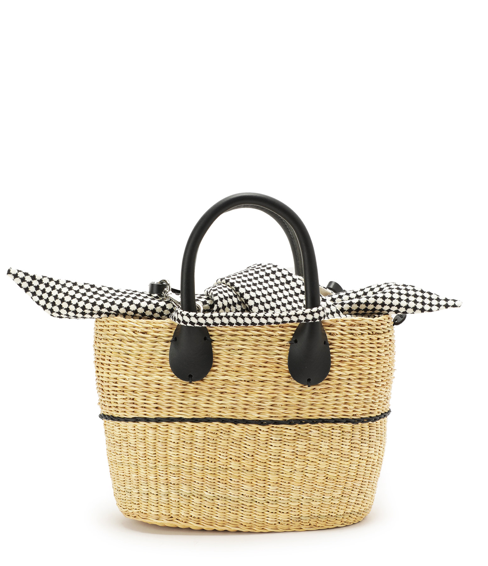 Petit panier rectangulaire en paille. Deux anses et une bandoulière amovible. Une rayure noir au milieu. Doublé d'un pochon en coton noir et blanc amovible. Base plate.