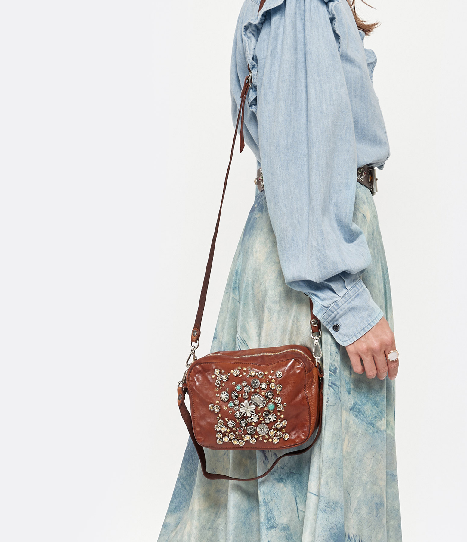 Petit sac bandoulière en cuir marron. Orné de rivets métalliques colorés sur l'avant. Une petite anse amovible et une grande bandoulière réglable et amovible. Fermeture par zip sur la partie supérieure. Intérieur doublé en coton et composé d'un compartiment unique.