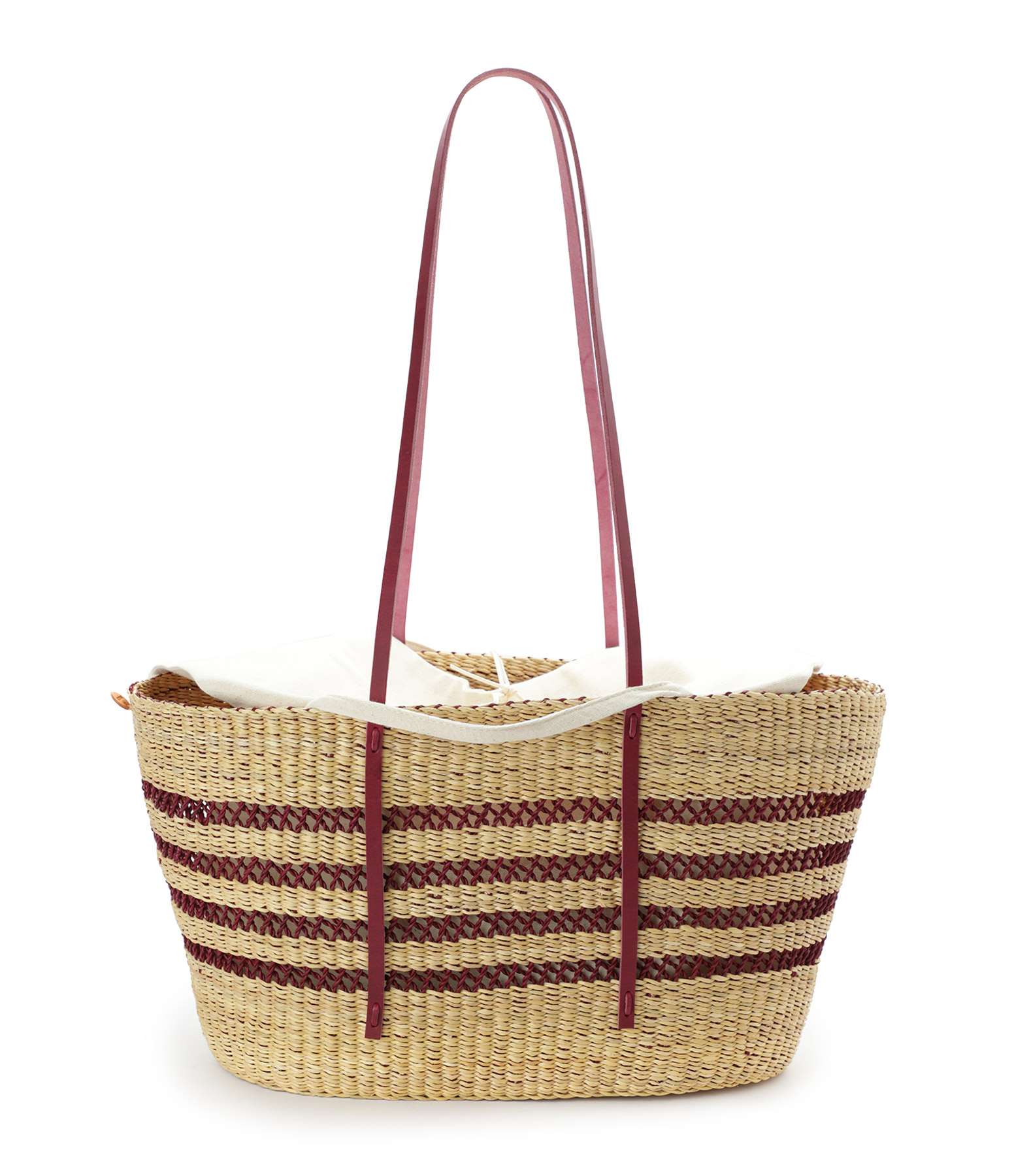 Panier en paille à rayures bordeaux. Deux grandes anses en cuir. Doublé d'un pochon en coton amovible. Base plate.