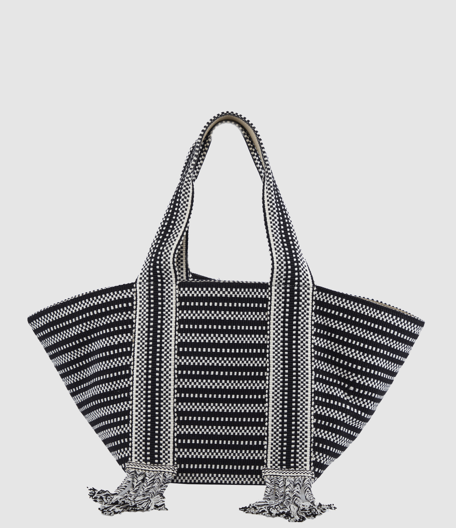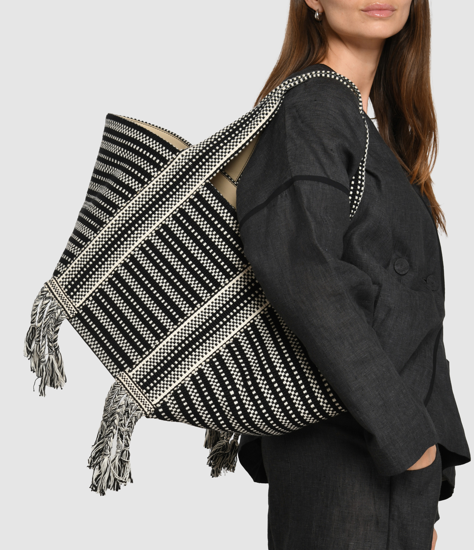 Sac en tissu à porter à la main ou à l’épaule, agrémenté de tresses pendantes.