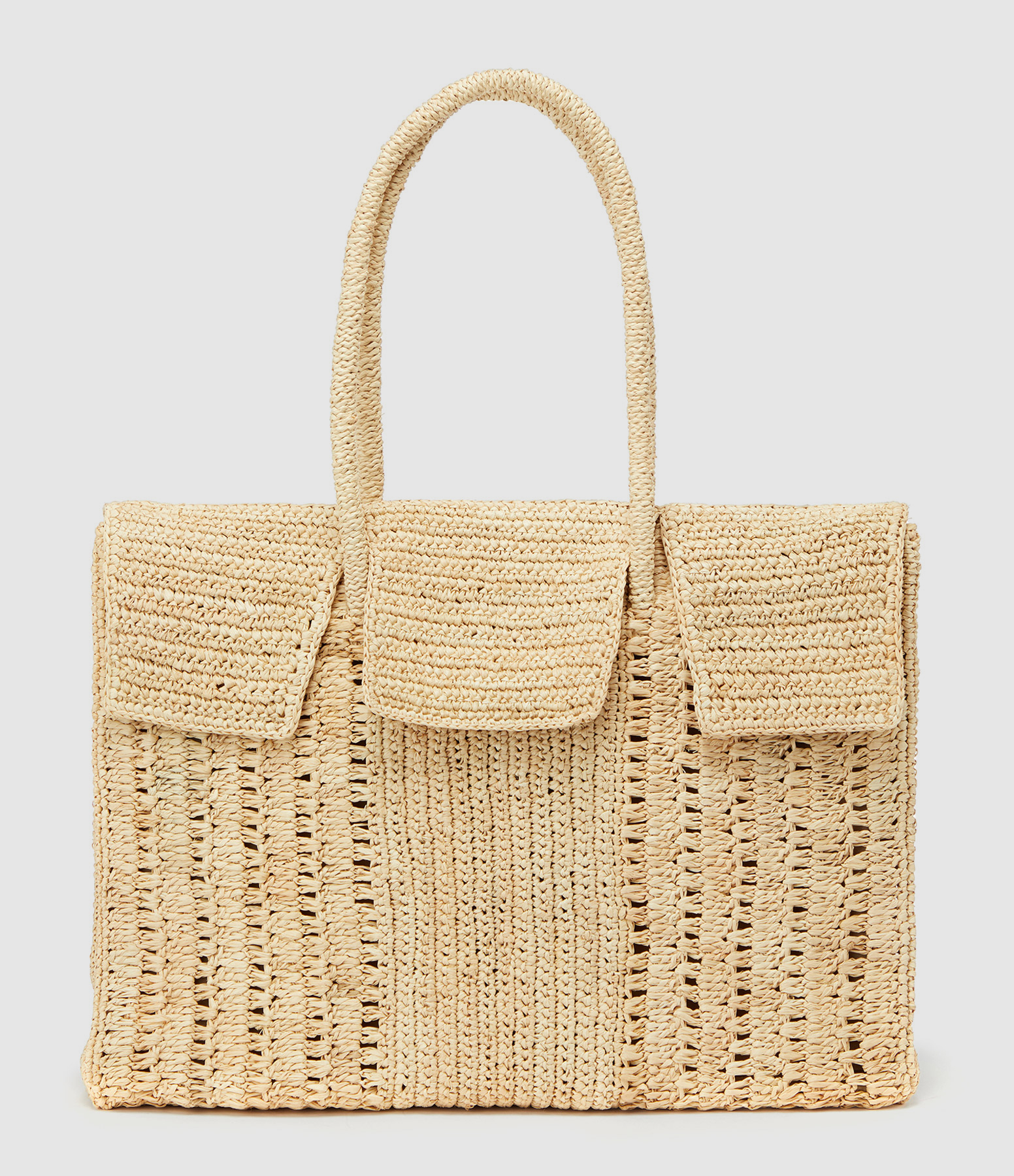 Sac à main avec 3 rabats en raphia naturel. Deux anses roulotées en raphia. Une poche plaquée en raphia.