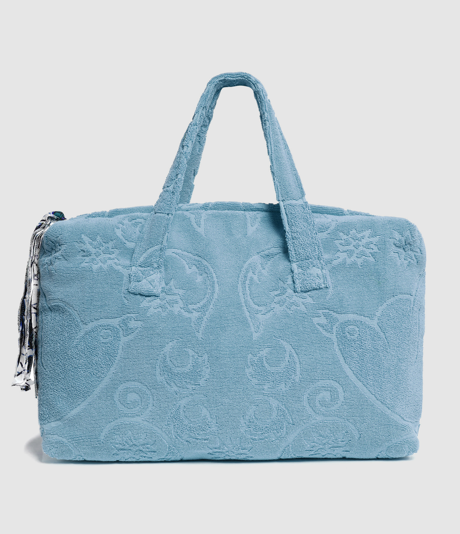 Sac de plage bleu denim en serviette éponge à motifs texturés. Fermeture par un zip orné d'un pompon. Intérieur doublé en tissu à imprimé wax (motifs africains).