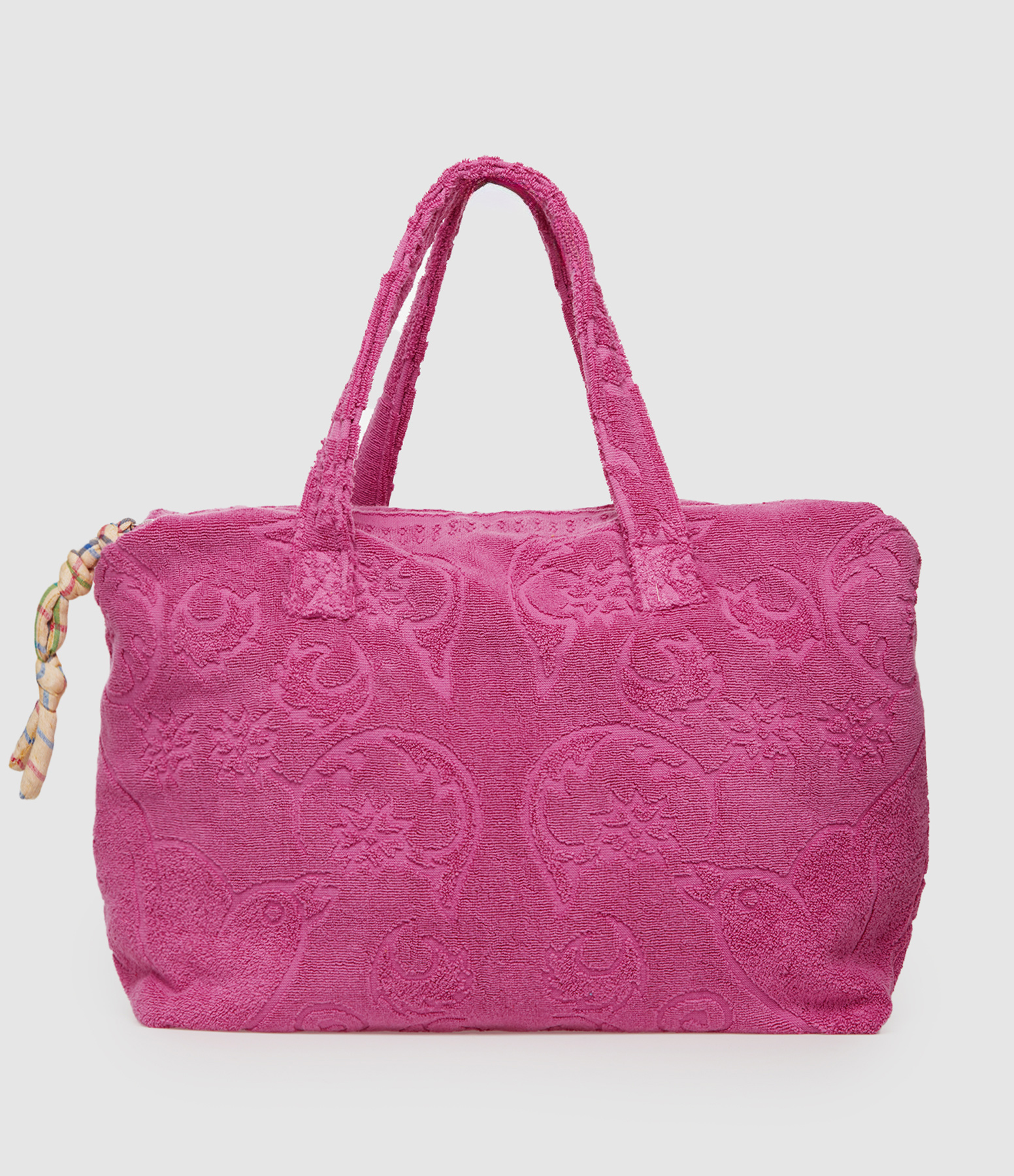 Sac de plage rose en serviette éponge à motifs texturés. Fermeture par un zip. Intérieur doublé en tissu à imprimé wax (motifs africains).