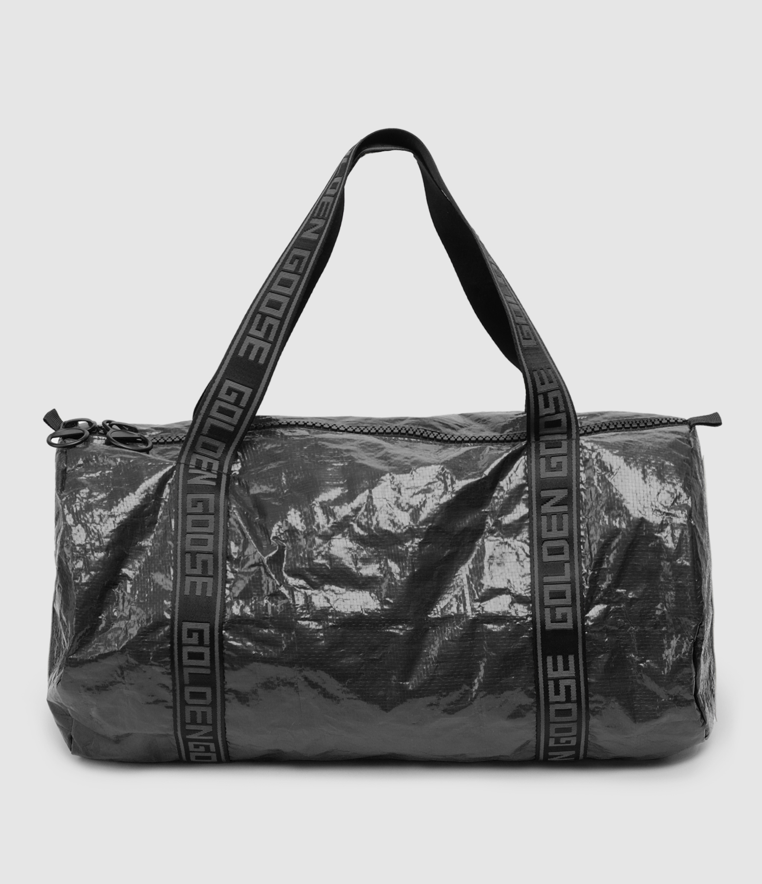 Sac bowling en plastique noir. Fermeture par zip. Deux anses noires avec inscription "Golden Goose". Etoile Golden écrue sur les côtés du sac. Non doublé.