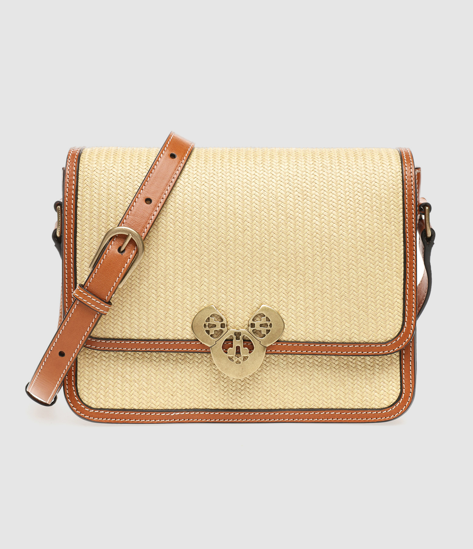 Sac en raphia beige à empiècements en cuir marron. Bandoulière ajustable pour porté épaule ou croisée. Fermeture à rabat aimanté avec détail ornement métallique doré. Intérieur organisé en deux compartiments avec une poche plaquée.